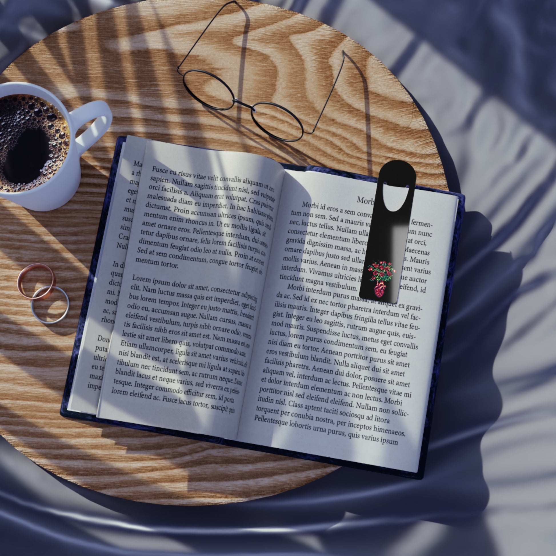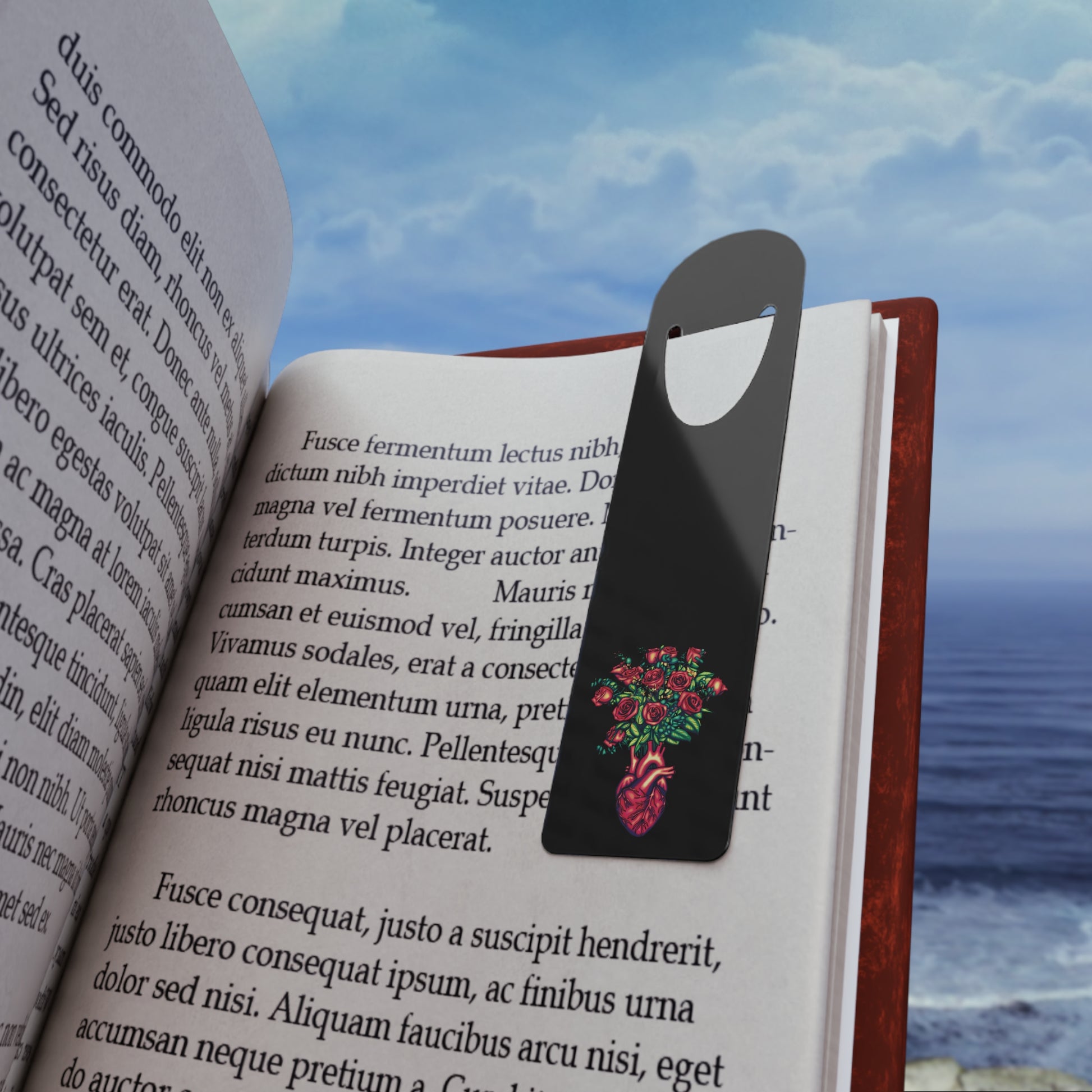 Add a touch of gothic romance to your reading experience with this striking metal bookmark featuring a vibrant anatomical heart design blooming with red roses. The sleek black aluminum construction provides durability while serving as the perfect canvas for the eye-catching artwork. The anatomical heart illustration showcases intricate details in rich red tones, with beautiful roses emerging from the top like a macabre vase, creating a stunning gothic aesthetic. The bookmark's smooth, minimalist shape is enhanced by an elegant U-shaped cutout at the top, making it easy to slip between pages while maintaining a sophisticated look. This unique bookmark masterfully combines functionality with artistic expression, making it an ideal accessory for literature lovers, medical students, anatomy enthusiasts, or anyone who appreciates distinctive gothic artwork. The aluminum construction ensures the bookmark maintains its shape without bending or creasing your pages. The high-contrast design stands out beautifully against book pages while adding a contemporary edge to your reading experience.