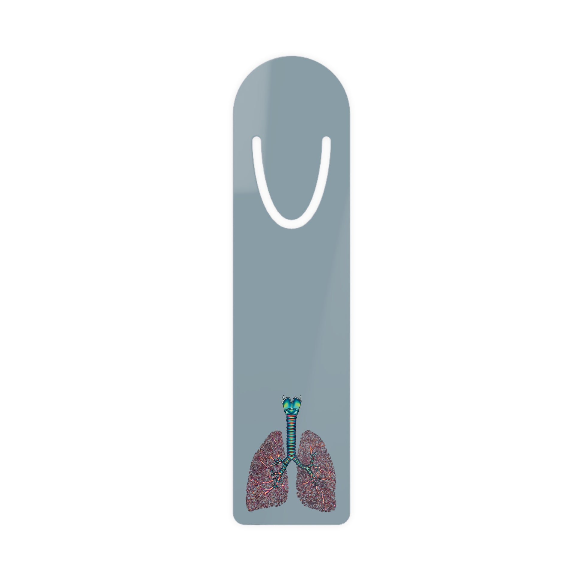Elevate your reading experience with this sophisticated slate blue aluminum bookmark featuring a detailed anatomical illustration of human lungs and bronchial tree. The sleek metal design showcases intricate medical artwork depicting the respiratory system in rich detail, with the bronchial passages rendered in eye-catching colors. The bookmark's minimalist profile is enhanced by a graceful U-shaped cutout at the top, making it easy to slip between pages while maintaining its refined appearance. Perfect for medical students, healthcare professionals, anatomy enthusiasts, or anyone who appreciates the intersection of science and style. The durable metal construction maintains its shape and the smooth, professional finish ensures your books stay protected. This unique bookmark seamlessly combines functionality with scientific artistry, making it an ideal accessory for textbooks, medical references, or your favorite novels. The anatomical design serves as both a practical page marker and a conversation starter, celebrating the beauty and complexity of human anatomy.