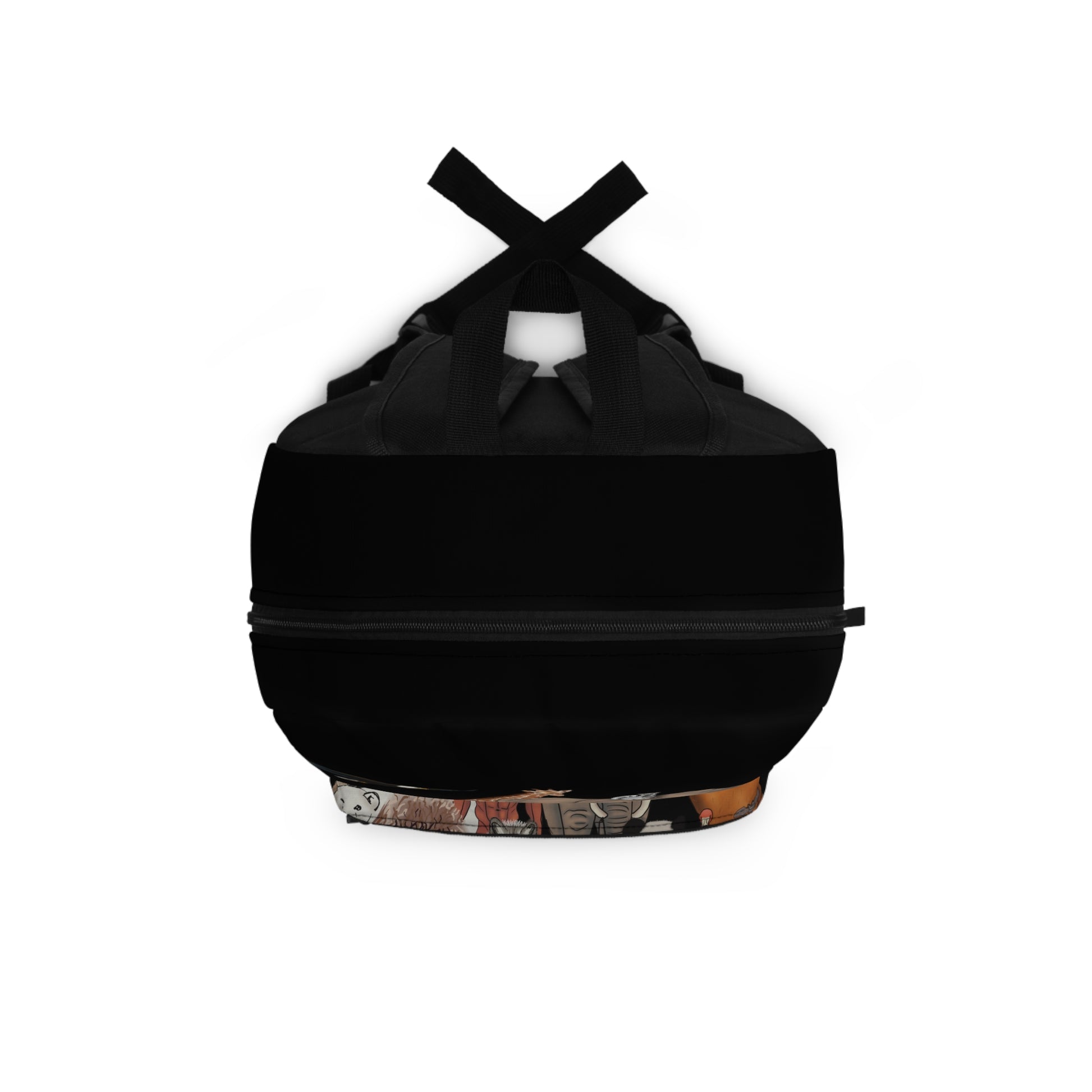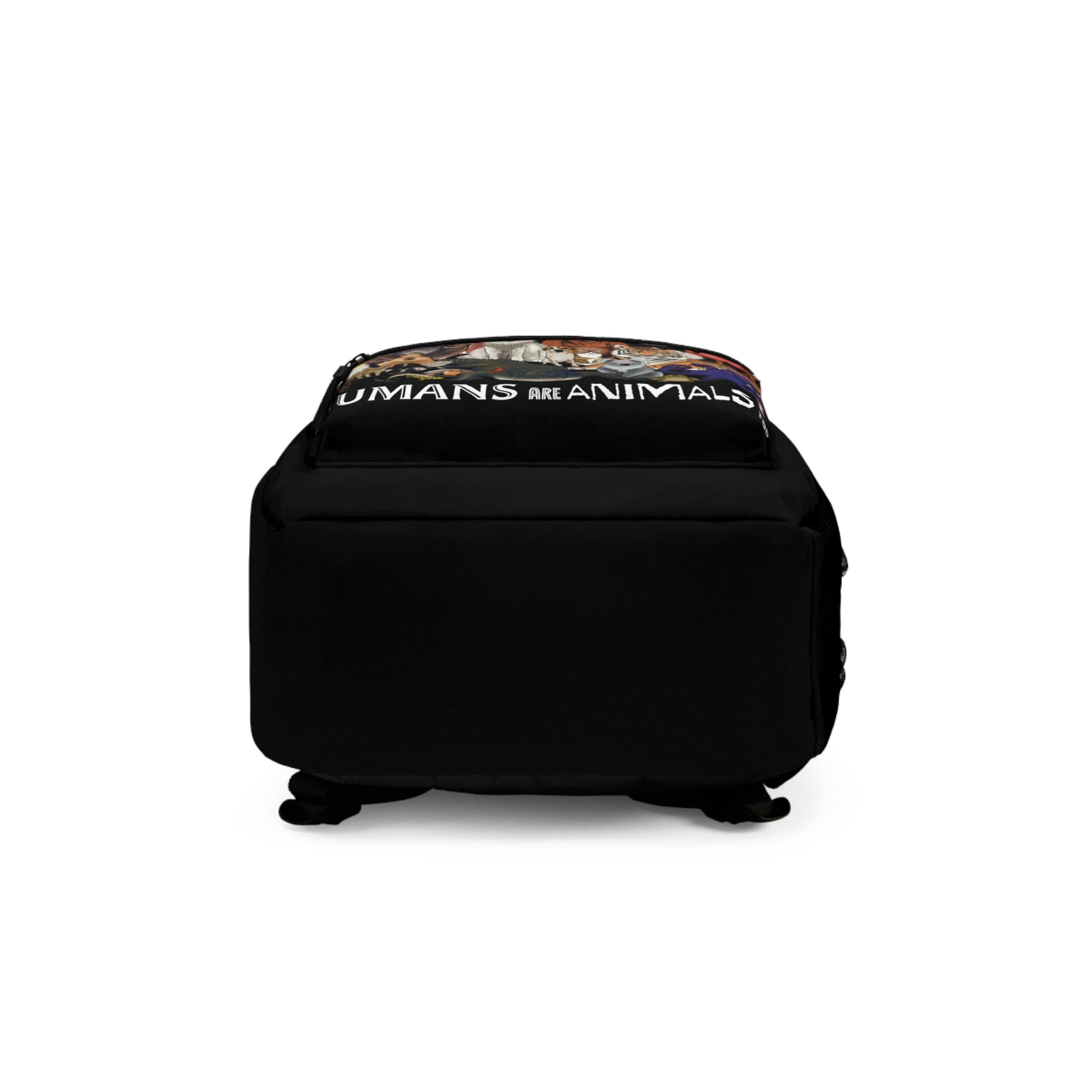 Make a bold statement with this striking black backpack featuring a captivating 'Humans Are Animals Too’ wildlife design. The unique artwork showcases a diverse collection of animals including elephants, tigers, giraffes, and various other creatures, creating an eye-catching visual statement. Whether you're heading to college, going on a day hike, or navigating your daily commute, this backpack combines practical functionality with striking design elements. Show off your love for animals and passion for wildlife conservation with this unique backpack.