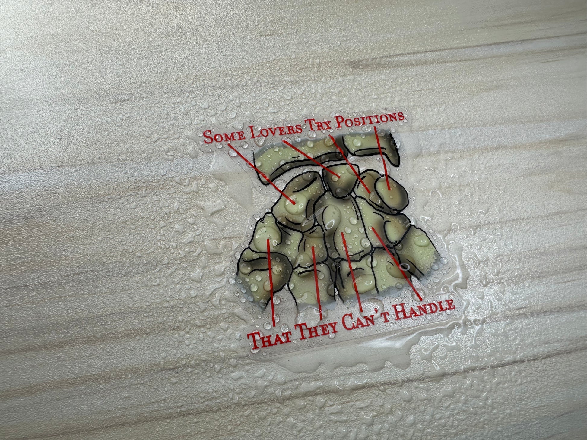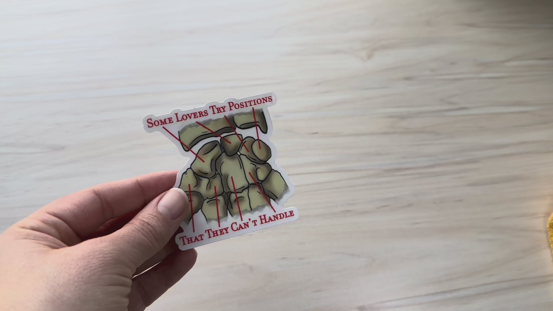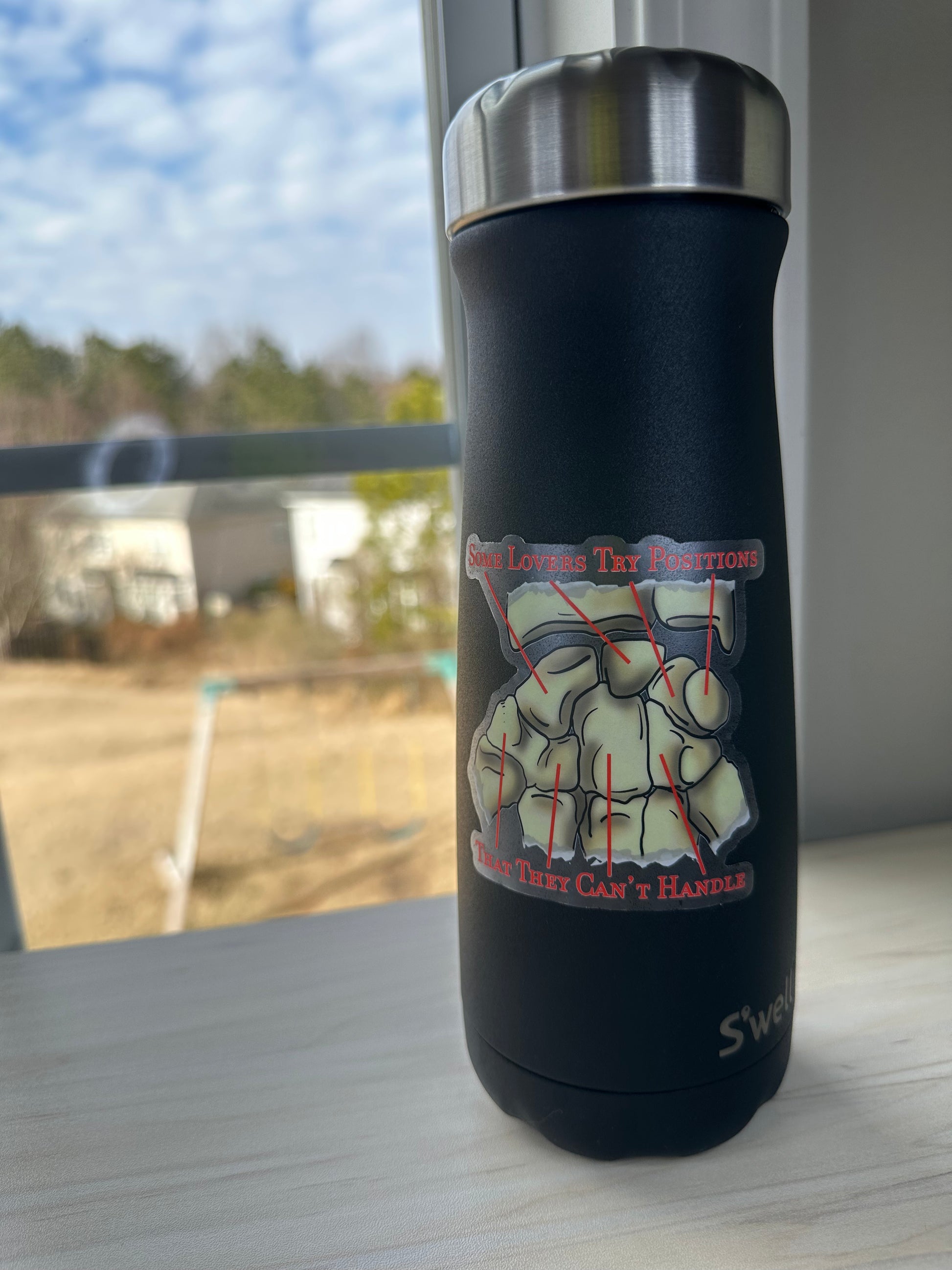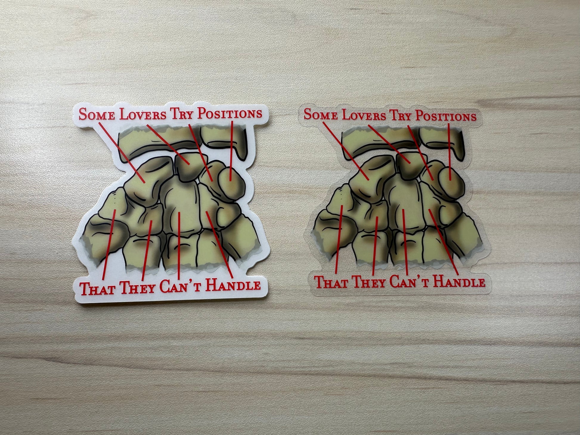 Add a touch of medical humor to your workspace with this clever anatomical mnemonic vinyl decal! This high-quality sticker features a creative carpal bone illustration accompanied by a witty text arrangement in front of a clear background. This durable vinyl decal is perfect for medical students, healthcare professionals, or anyone who appreciates anatomy-themed humor. The sticker showcases detailed anatomical artwork in neutral tones with striking red text overlay with the classic mnemonic, ‘Some Lovers Try Positions That They Can’t Handle’. Whether used as a study aid or decorative element, this anatomical mnemonic sticker combines educational value with a dash of humor that's sure to spark interest in any medical setting.