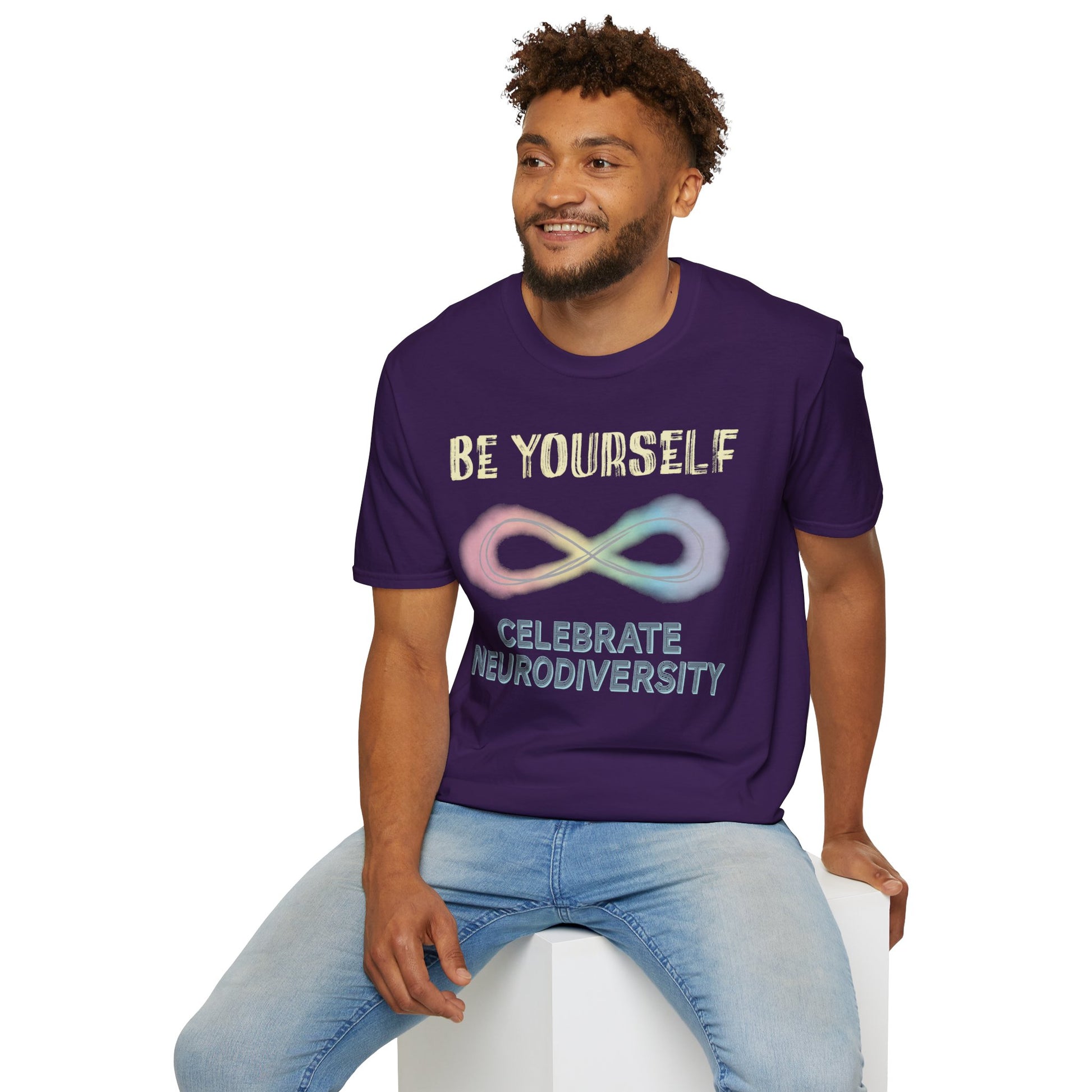 Make a powerful statement with this meaningful t-shirt featuring an inspiring neurodiversity message. The design showcases a beautiful pastel-colored rainbow infinity symbol, symbolizing the vast spectrum of human neurodiversity, paired with bold text reading 'BE YOURSELF' and 'CELEBRATE NEURODIVERSITY'. This shirt isn't just clothing - it's a conversation starter and a proud declaration of acceptance and understanding. Perfect for everyday wear, awareness events, or showing support for the neurodivergent community. The design features a unique blend of soft pastel colors including pink, yellow, and blue that flow seamlessly through the infinity symbol. Whether paired with jeans for a casual look or dressed up, this t-shirt helps spread an important message while maintaining style and comfort. Wear this shirt to support people with autism, ADHD, dyslexia, and more.