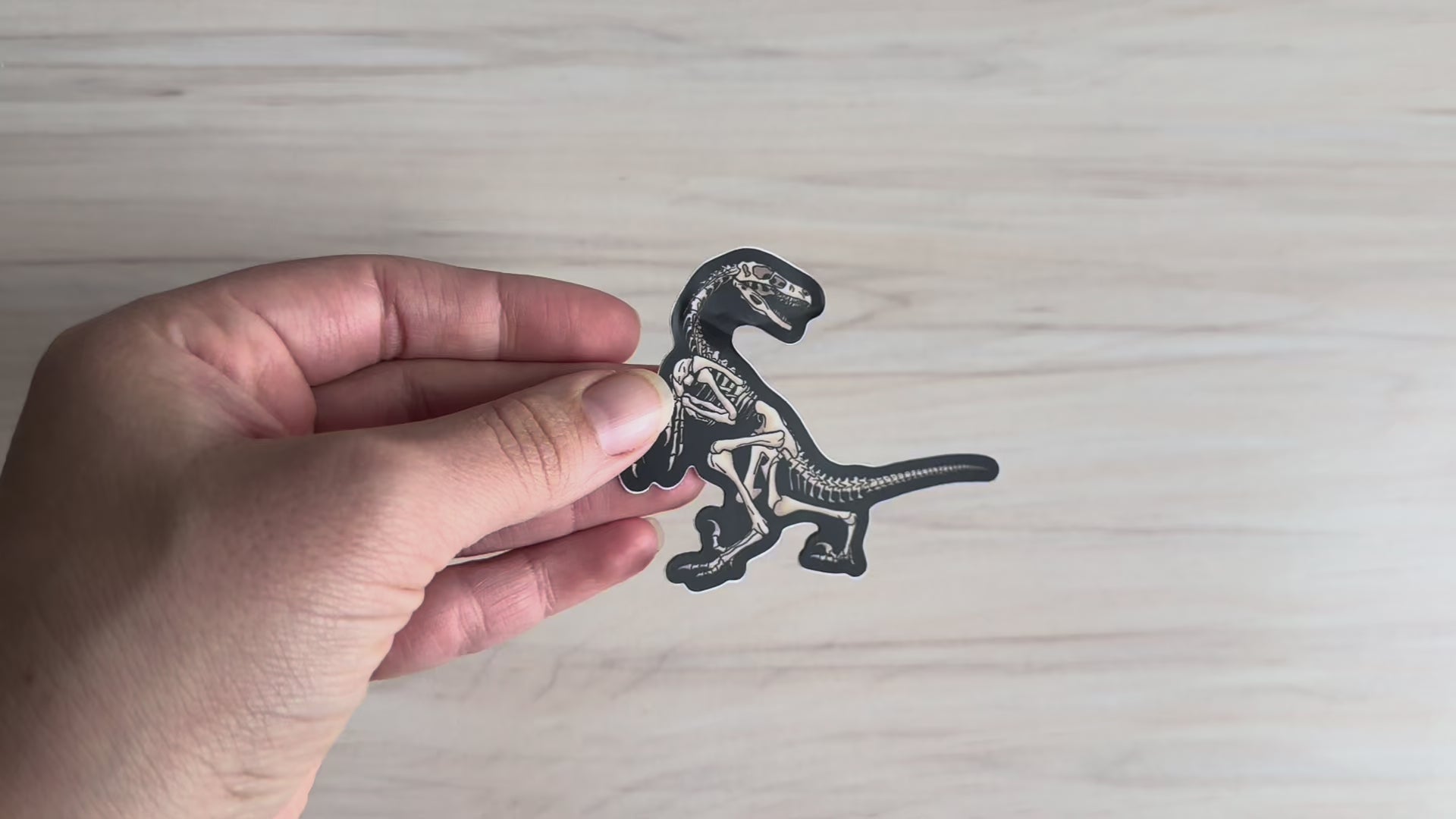 Transform any surface into a prehistoric display with this striking velociraptor skeleton sticker. The detailed bone-white fossil design stands out dramatically against a deep black background, capturing the fierce predator in its classic hunting pose. This vinyl decal showcases the velociraptor's distinctive features - from its curved claws to its elongated skull and razor-sharp teeth. Perfect for dinosaur enthusiasts of all ages, this high-quality vinyl sticker adds a paleontological touch to laptops, water bottles, walls, or any smooth surface. The stark contrast between the skeletal design and black background creates an eye-catching effect that brings the Mesozoic era into modern spaces.
