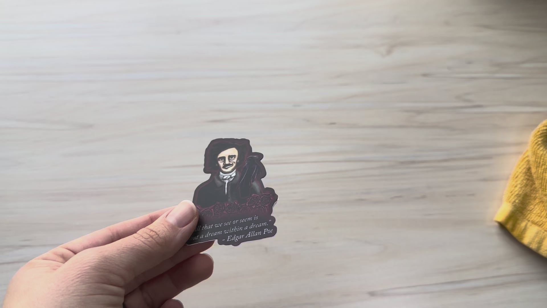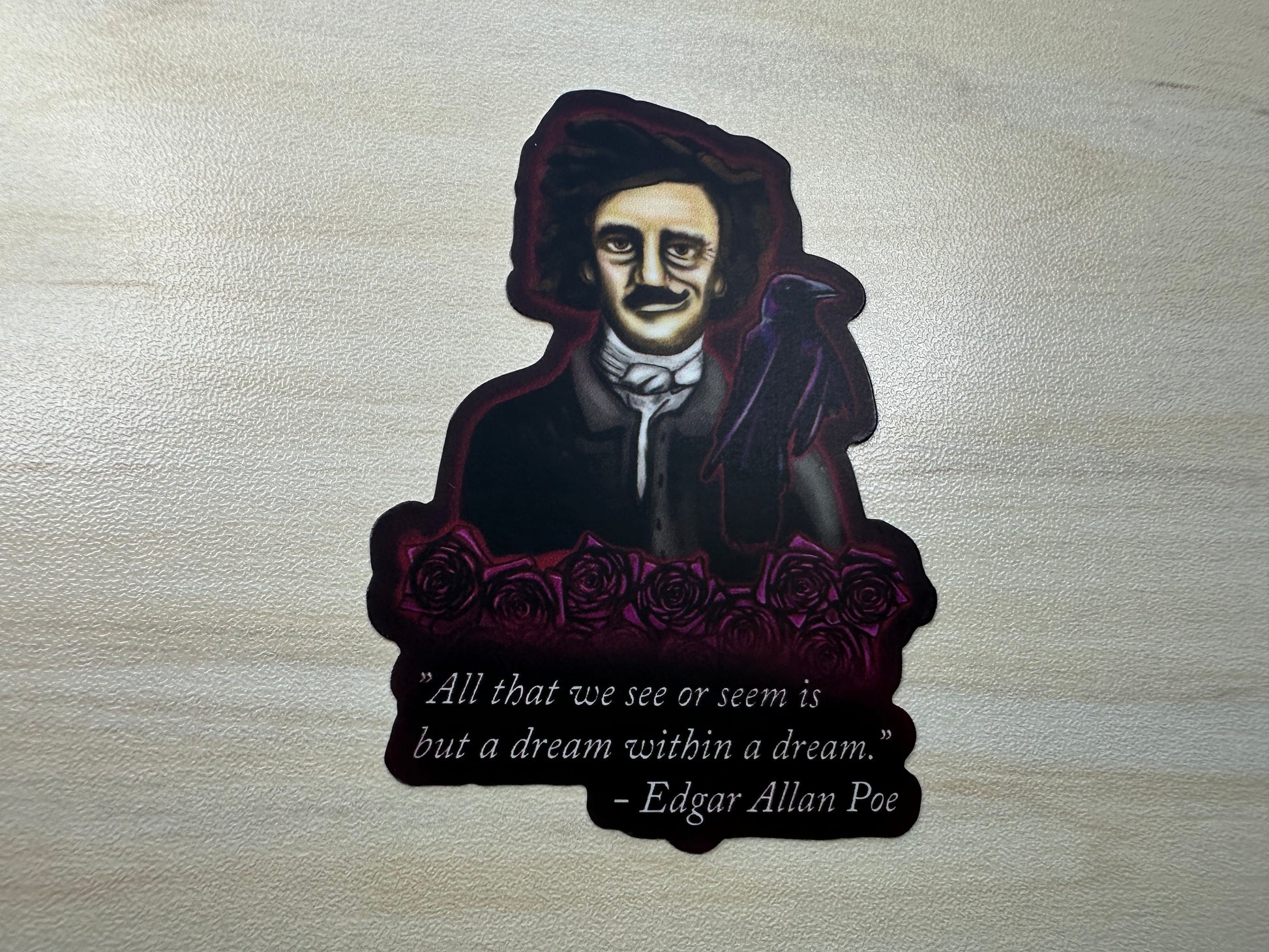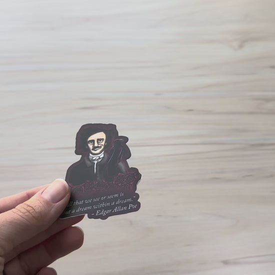 Transform your space with this hauntingly beautiful decorative vinyl sticker featuring a hand-drawn portrait of Edgar Allan Poe. The design showcases a striking portrait against a deep crimson background, accompanied by a mysterious raven and adorned with darkly romantic roses. The centerpiece is the profound quote 'All that we see or seem is but a dream within a dream' - a testament to the mastery of Gothic literature. Whether you're a literature enthusiast, Gothic art lover, or simply searching for a unique decorative element, this vinyl decal offers a sophisticated way to showcase your literary interests. A great gift for English professors, writers, and lovers of Gothic literature.