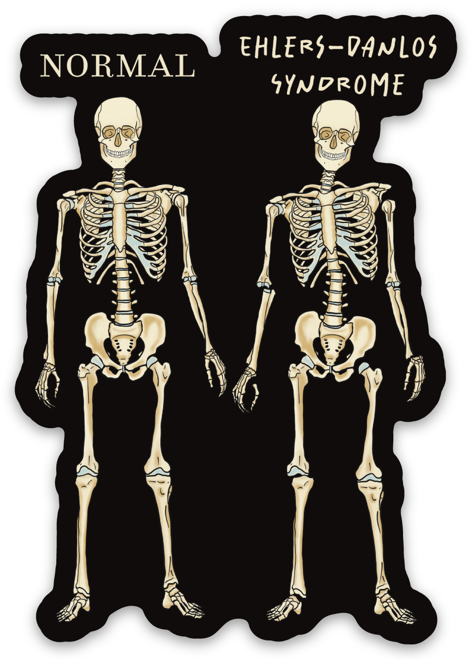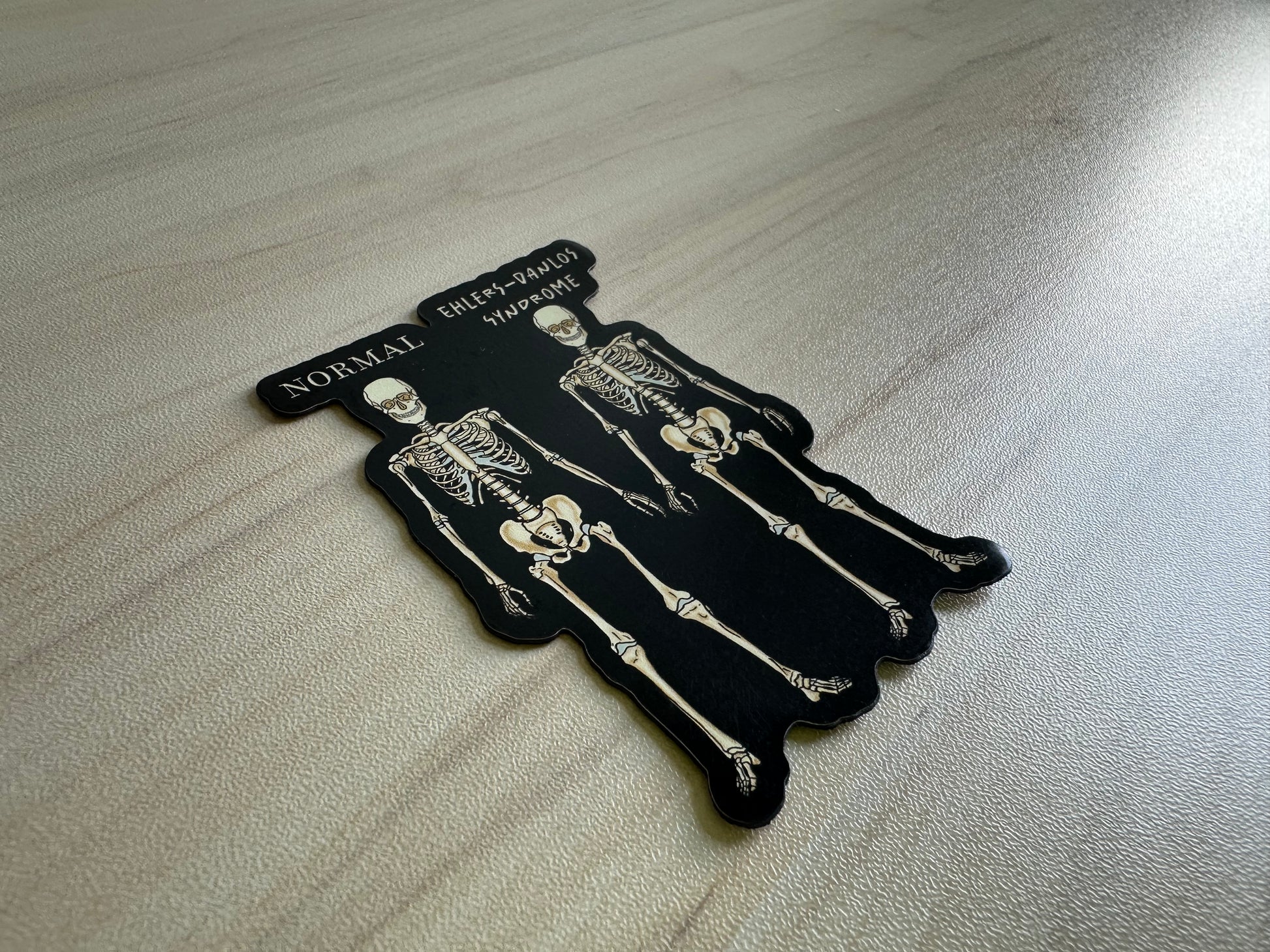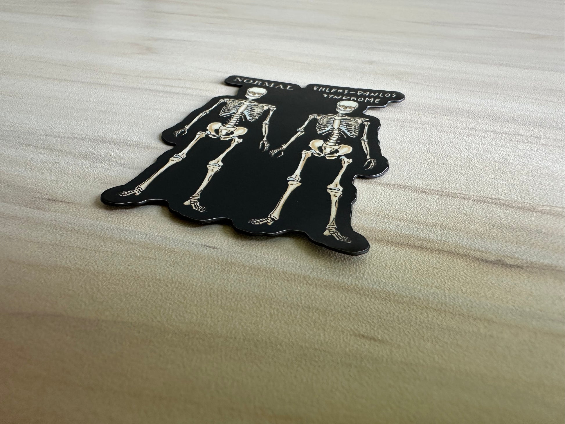 This striking Ehlers-Danlos Syndrome magnet features two detailed skeletal illustrations - one showing normal anatomy and one depicting EDS characteristics. Set against a sleek black background, this medical illustration serves as both an informative reference and a meaningful awareness piece. The high-contrast bone illustrations in cream tones make the anatomical details pop, perfect for medical students, healthcare professionals, or anyone interested in understanding this complex condition. This durable magnet will stick to any metallic metal surface like lockers, white boards, cars, and more. It's an excellent conversation starter for raising awareness about Ehlers-Danlos Syndrome and the effects of this connective tissue disorder on the skeletal system.