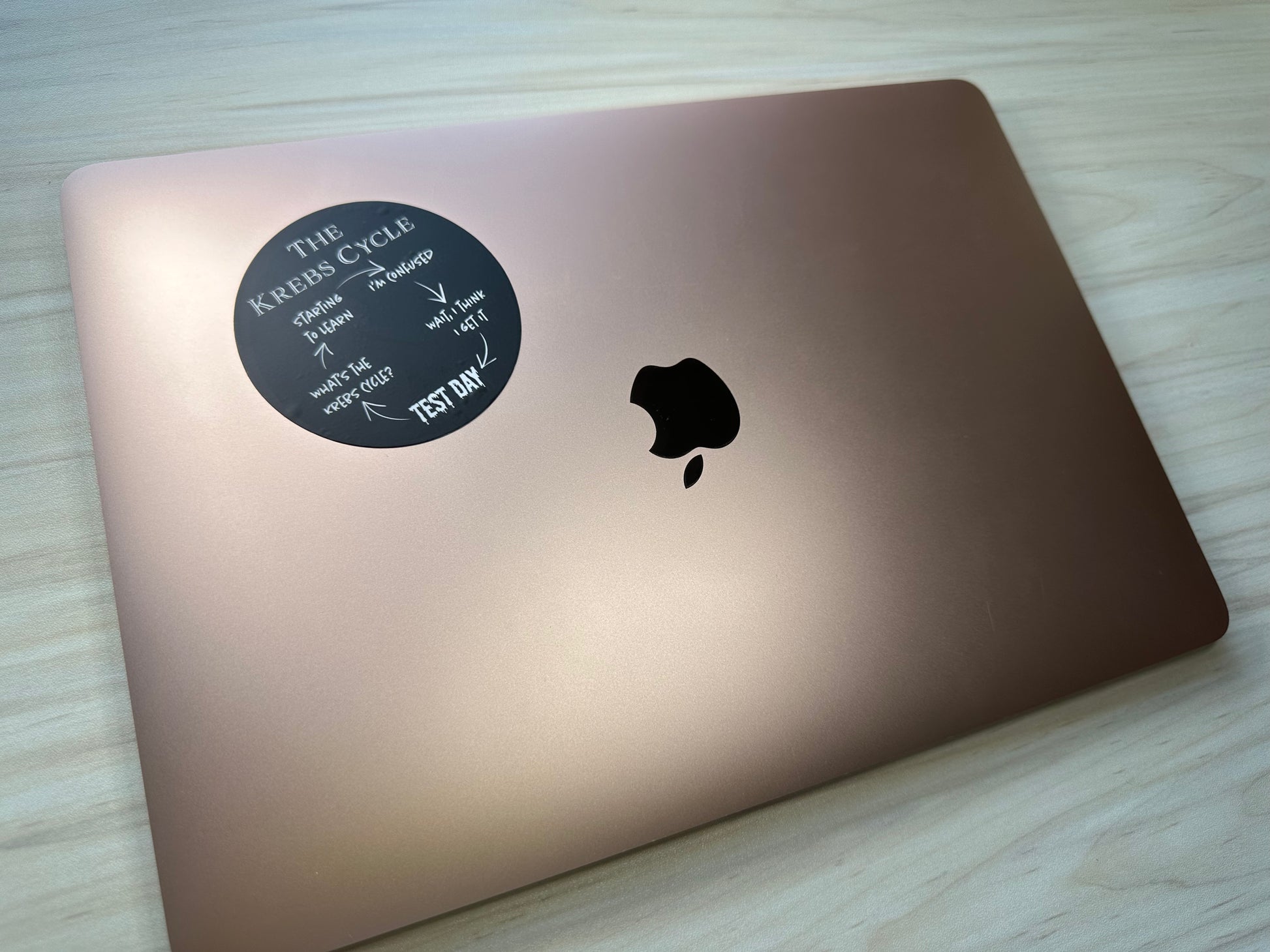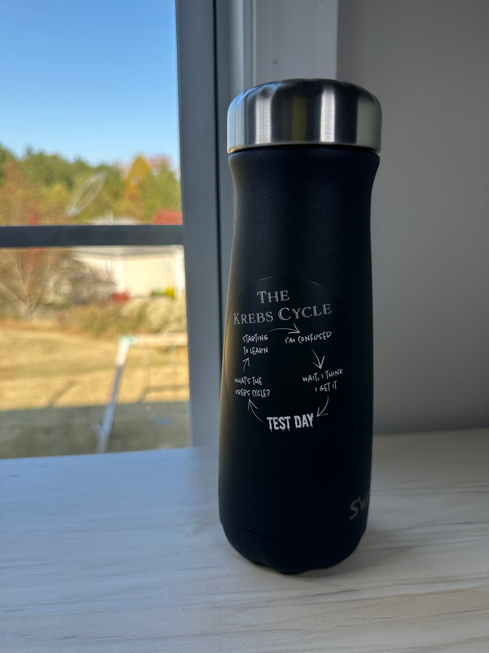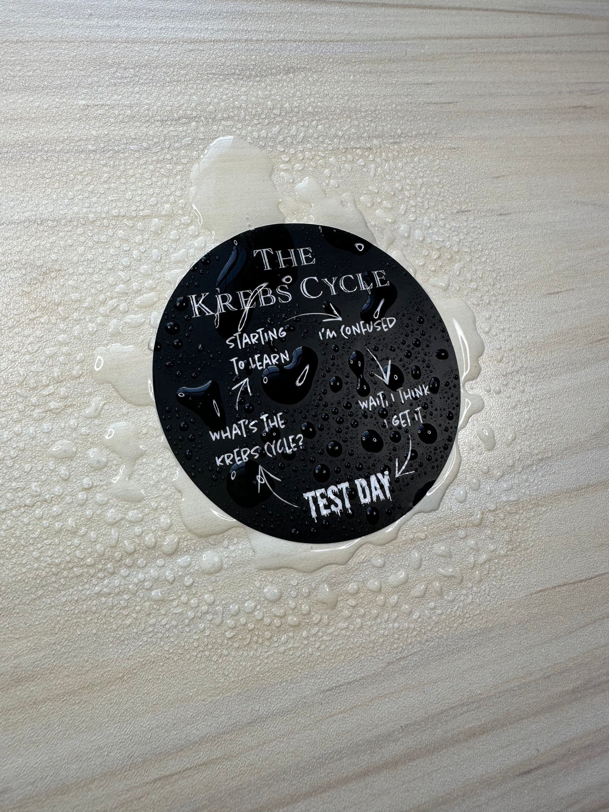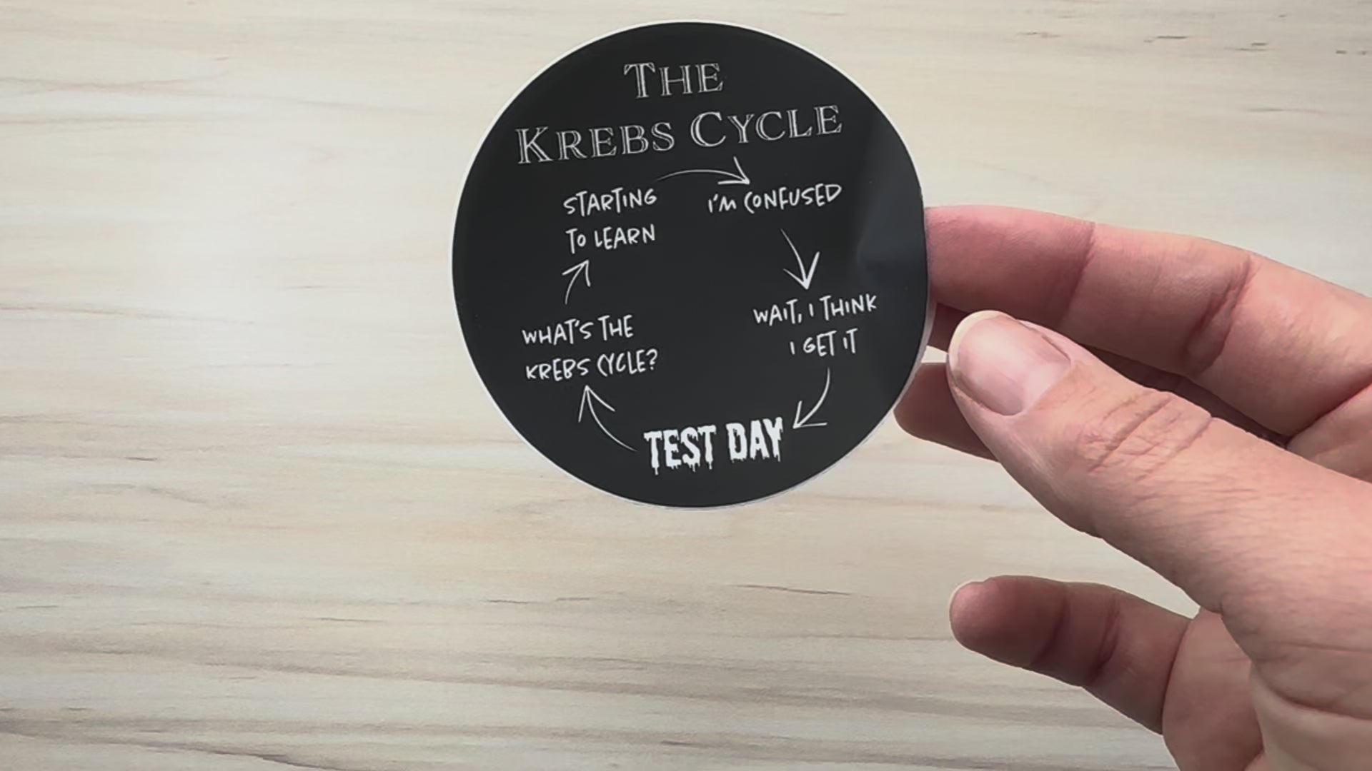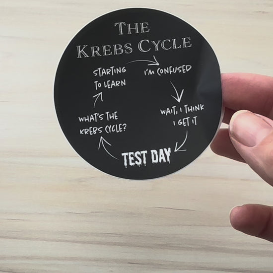 Add a touch of academic humor to your study materials with this clever die-cut sticker featuring 'The Krebs Cycle' learning process. This witty design perfectly captures the nearly universal student experience of tackling complex biochemistry concepts, illustrated through a simple yet relatable cycle: from 'What's the Krebs Cycle?' to 'Starting to Learn,' followed by 'I'm Confused,' and 'Wait, I Think I Get It,' only to circle back when 'Test Day' arrives. Perfect for decorating laptops, notebooks, water bottles, or any smooth surface, this durable sticker resonates with biology students, teachers, and anyone who's ever grappled with understanding cellular respiration or the citric acid cycle. The clean, black and white design features clear text and directional arrows, making it both visually appealing and humorous. Show off your science sense of humor while commemorating the shared experience of mastering challenging academic concepts. This sticker is an ideal gift for biology students, science enthusiasts, or anyone who appreciates academic-themed humor.