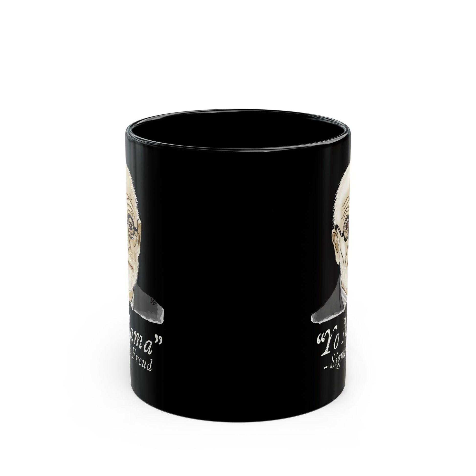 This black mug features a hand-drawn portrait of Sigmund Freud with a joking quote that says 'yo mama'. Perfect for coffee or tea lovers with a sense of humor, this mug adds a fun and quirky touch to your morning routine. Ideal for adults looking for a unique conversation starter or a thoughtful gift for psychology enthusiasts. Great for birthdays, Father's Day, or just because.