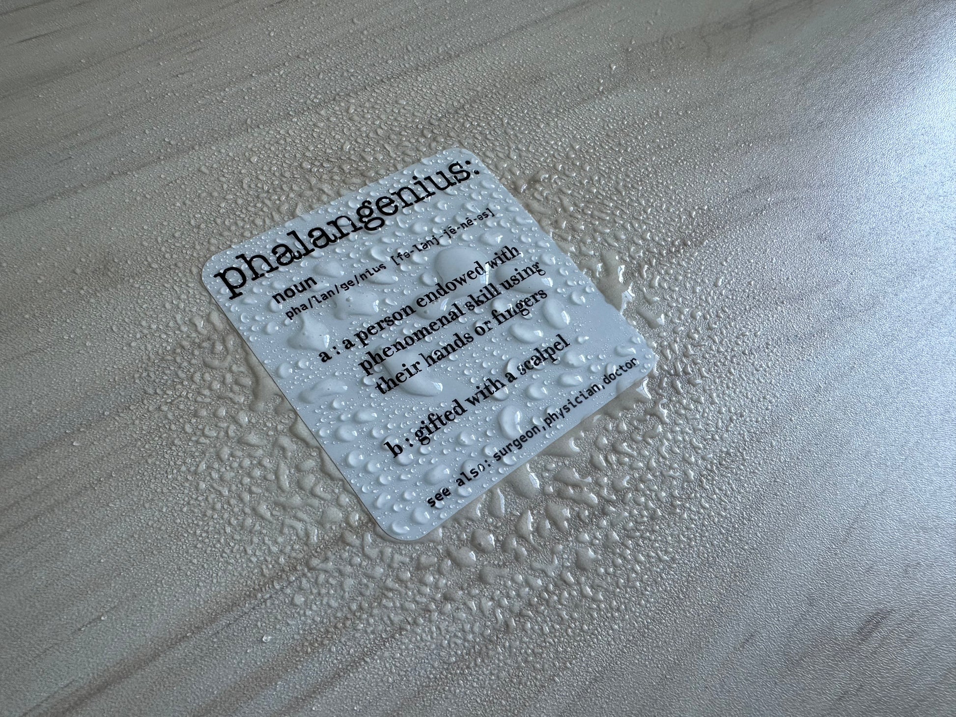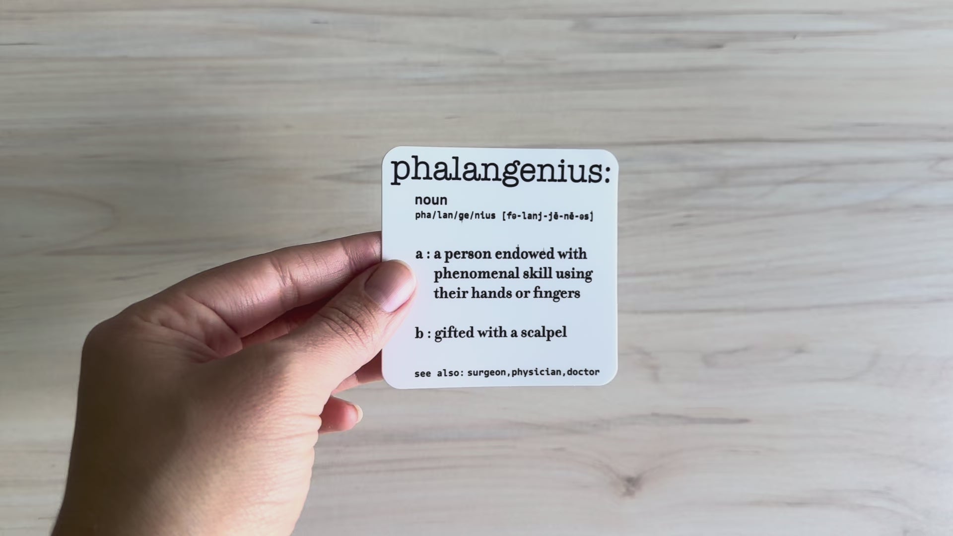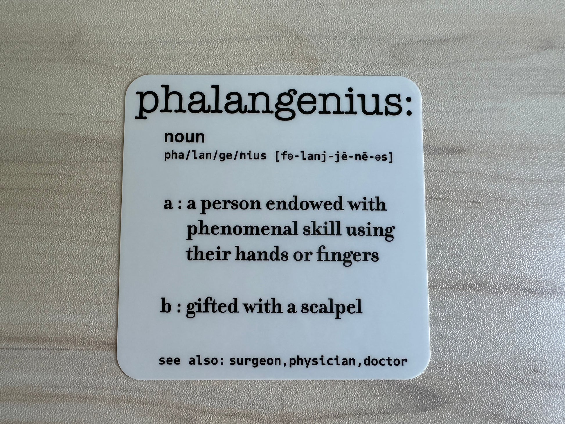 Add a touch of medical humor to your workspace with this clever dictionary-style vinyl sticker featuring the word 'phalangenius' - a witty blend of 'phalange' and 'genius.' This high-quality vinyl decal showcases a professional dictionary entry layout complete with pronunciation guide and humorous medical definitions. Perfect for medical professionals, students, or anyone who appreciates clever wordplay, this durable vinyl sticker adheres smoothly to laptops, water bottles, notebooks, or any clean, flat surface. Make a statement with this unique conversation starter that celebrates both linguistic creativity and medical expertise. A great gift for your surgeon, colleagues, medical students, and more.