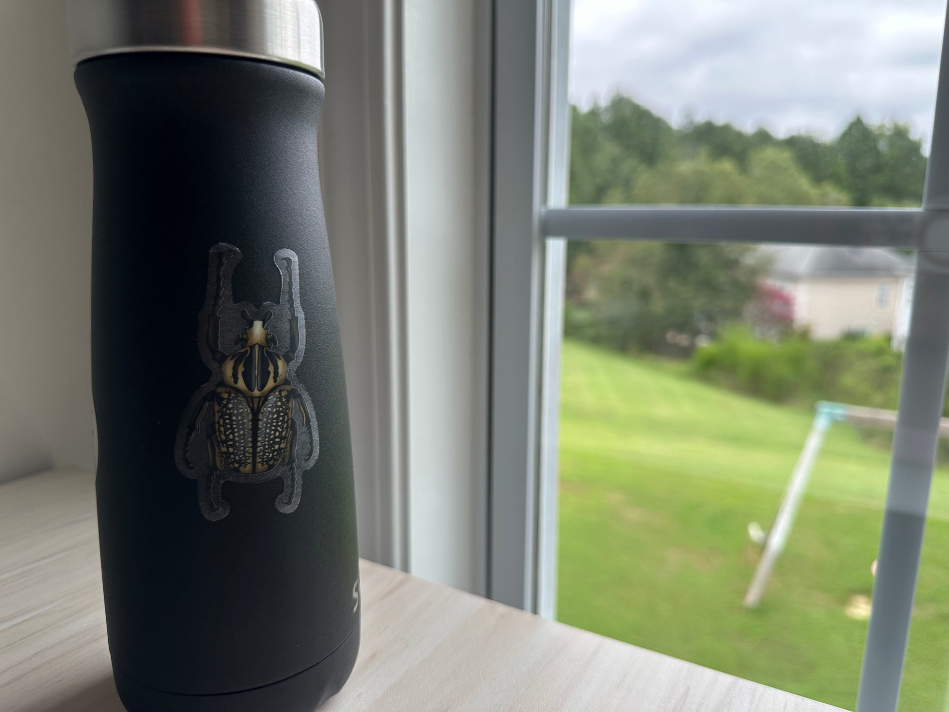 Transform any surface with this striking Goliath Beetle clear vinyl sticker, a must-have for nature enthusiasts and insect lovers alike. This meticulously detailed decal showcases the magnificent Goliath Beetle in rich gold and black tones, capturing the intricate patterns and distinctive features of one of nature's most impressive insects. The clear vinyl material allows the sticker to seamlessly blend with any background while maintaining its eye-catching appeal. Perfect for personalizing laptops, notebooks, water bottles, or creating unique wall decorations, this durable decal brings an artistic touch of entomology to your space. The sticker features precise cuts following the beetle's natural contours, making it appear as if a real specimen has landed on your chosen surface. Whether you're a budding entomologist, a science enthusiast, or simply appreciate beautiful natural designs, this high-quality vinyl sticker makes a distinctive addition to your collection of decorative elements.