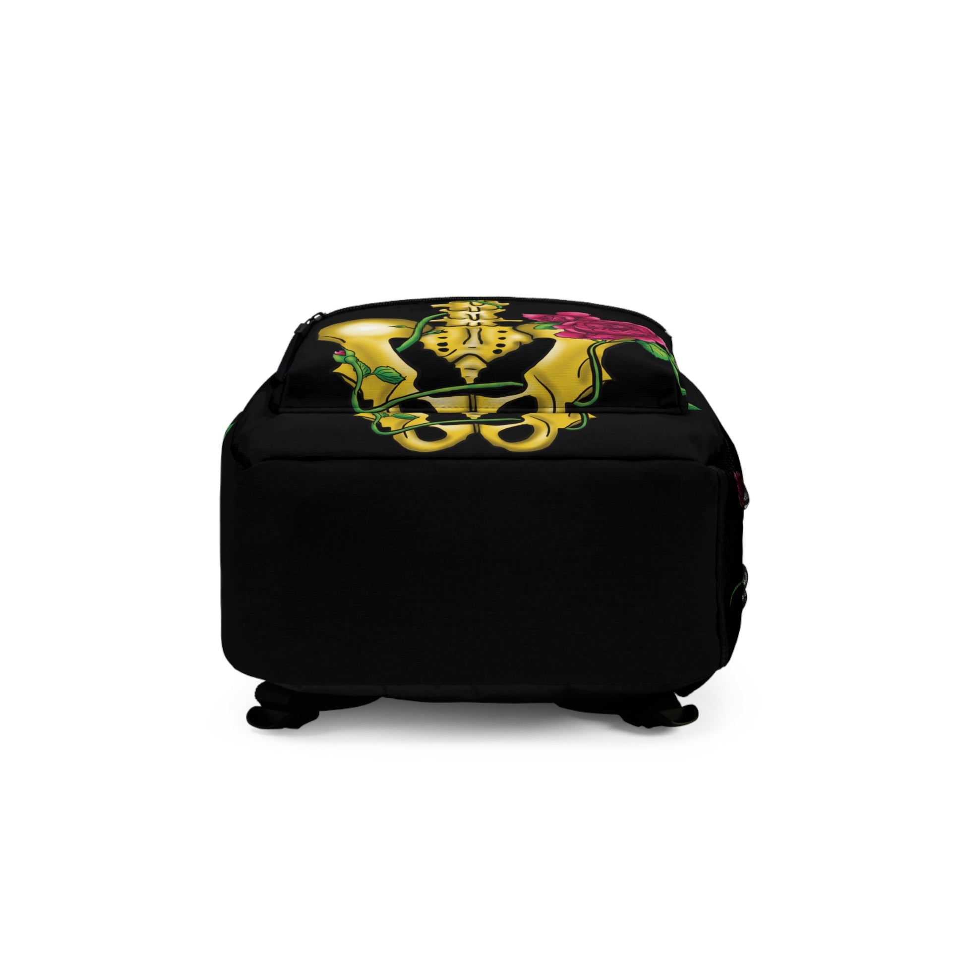Make a bold statement with this striking Gothic-style backpack featuring an anatomically-detailed golden skeleton design beautifully intertwined with vibrant pink roses against a deep black canvas background. This unique accessory combines edgy aesthetics with practical functionality, perfect for those who appreciate alternative fashion. The spacious main compartment and additional front zipper pocket provide ample storage for daily essentials, while mesh side pockets offer extra convenience. The backpack features durable construction with comfortable black adjustable straps and a sturdy top handle for versatile carrying options. The intricate artwork showcases detailed bone structure adorned with lush roses and green foliage, creating a stunning contrast that's sure to turn heads. Whether you're heading to class, work, or just out for the day, this backpack delivers both style and substance. The polyester material ensures durability for daily use, while the distinctive design serves as an artistic expression of the beautiful and macabre. A great gift for anatomy enthusiasts, healthcare professionals, medical students, and anyone who appreciates Gothic style.