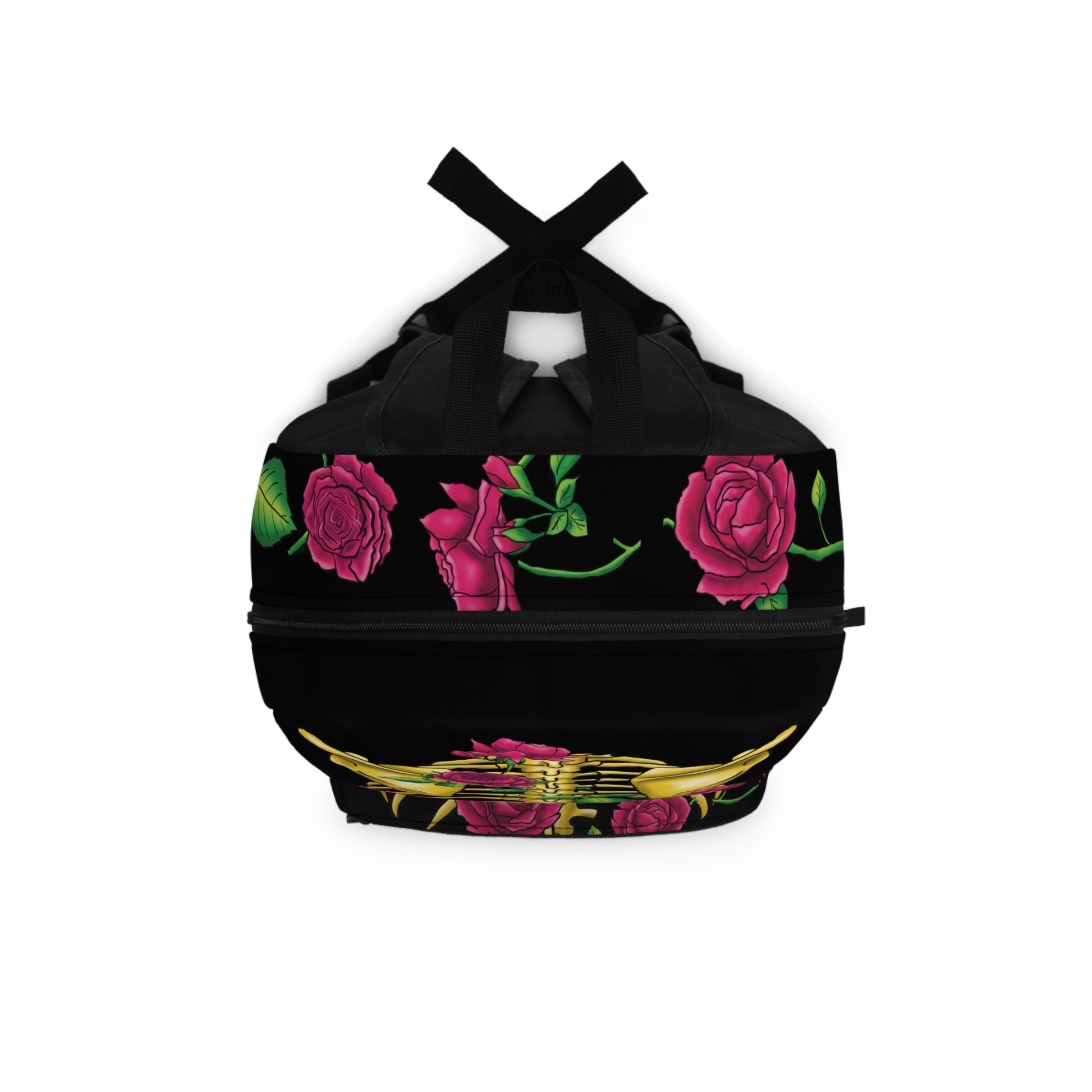 Gothic Skeleton Backpack, Gold Skeleton With Pink Roses, Black Book Bag, Anatomy Backpack