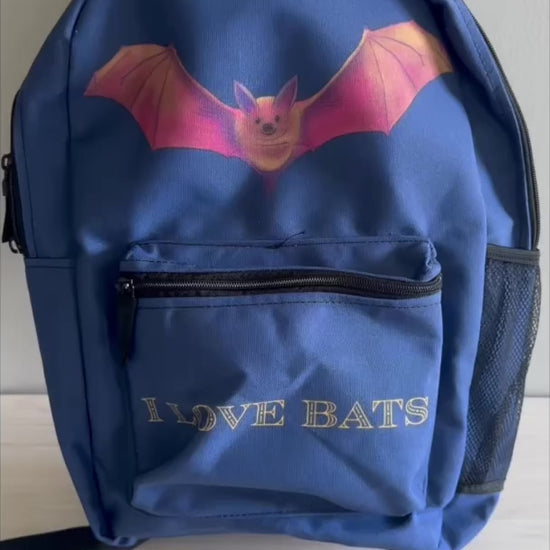 Make a statement with this navy blue backpack featuring a striking bat design and bold 'I LOVE BATS' text in yellow lettering. The classic navy blue base color creates an elegant backdrop for the eye-catching orange and red bat illustration, making this backpack a unique accessory for bat enthusiasts or anyone looking to showcase their love for these fascinating creatures. Whether you're heading to class, commuting to work, or embarking on casual outings, this backpack combines practical functionality with distinctive style.