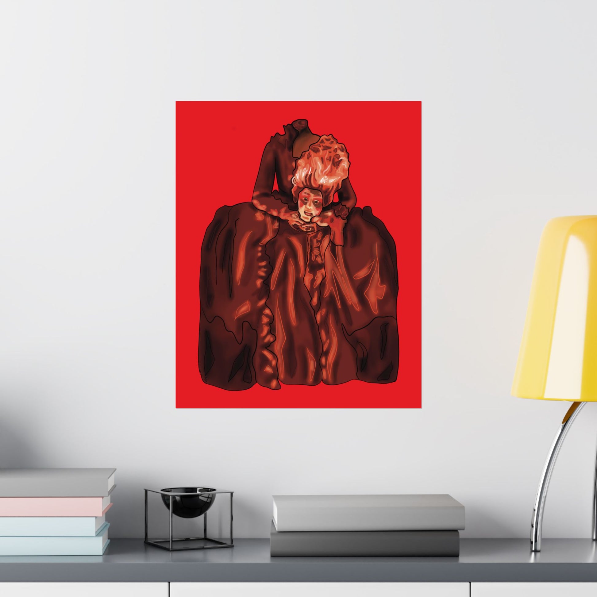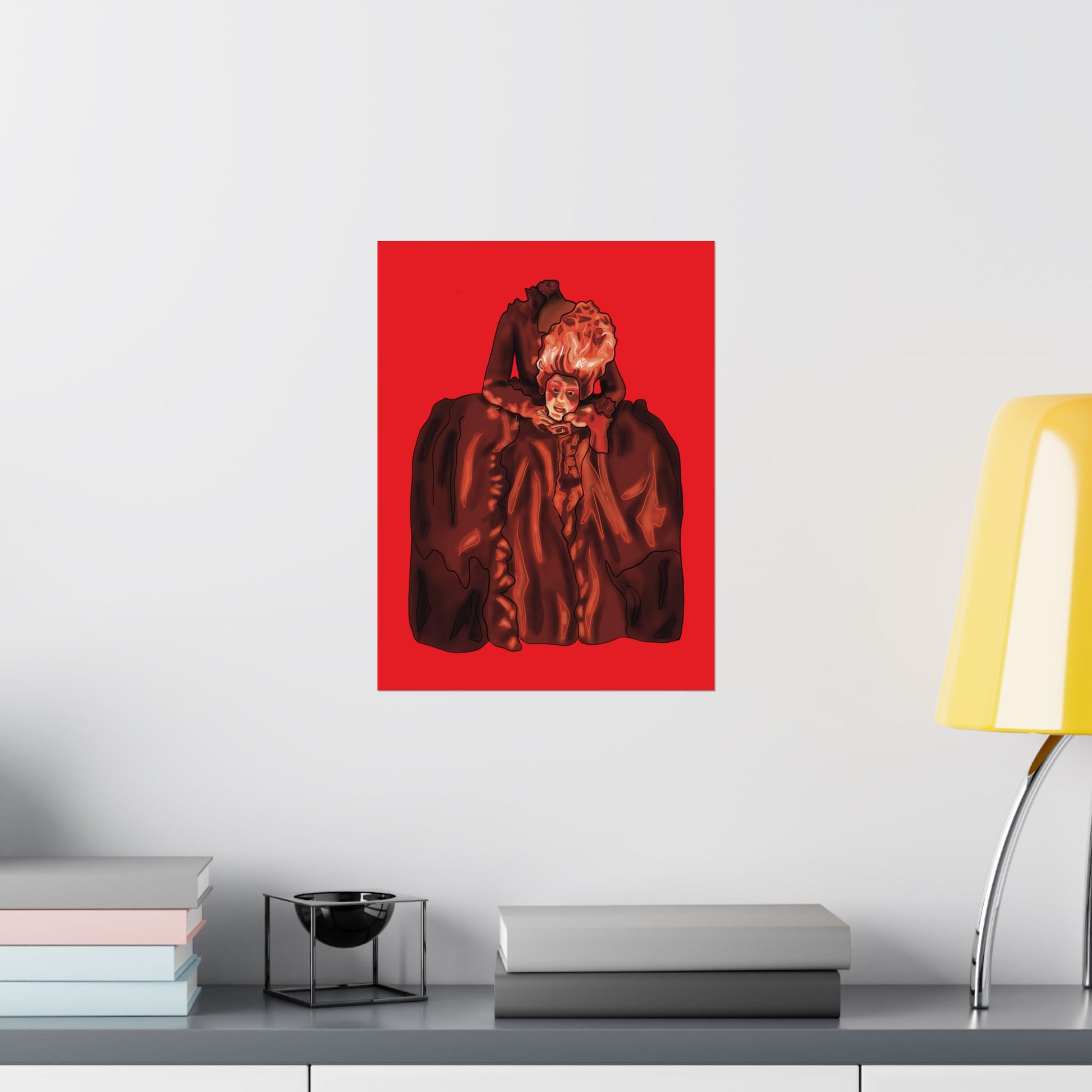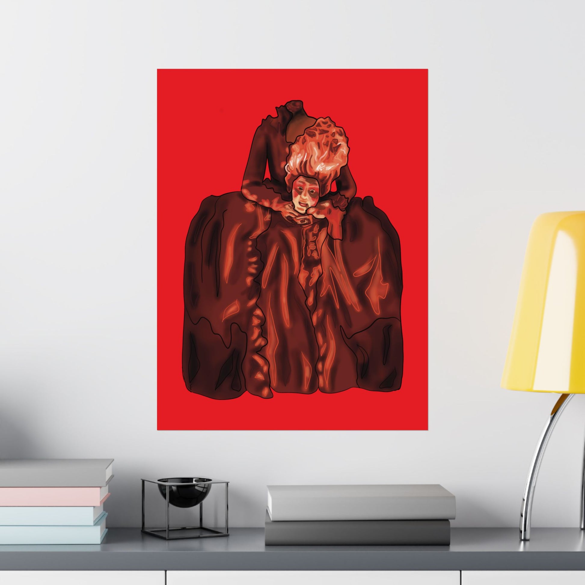 Transform your space with this striking artistic portrait poster featuring a dramatic interpretation of the beheaded Marie Antoinette. The Gothic-style artwork presents an elegant historical figure rendered in deep burgundy hues against a vivid red background, creating a bold visual statement. The dramatic composition showcases elaborate period costume details with flowing fabrics and intricate ruffles, capturing the essence of 18th-century French aristocratic fashion and French rococo style. This sophisticated art print makes an impressive focal point for home decor, perfect for adding a touch of classical elegance to living rooms, studies, or hallways. The poster's distinctive style combines historical elements with contemporary artistic flair, making it an eye-catching piece for art enthusiasts and history buffs alike. Available in various sizes to suit your space, this high-quality print features sharp detail reproduction and rich color saturation that brings the dramatic portrait to life. The striking contrast between the deep browns and vibrant red background creates a powerful visual impact that commands attention in any room.