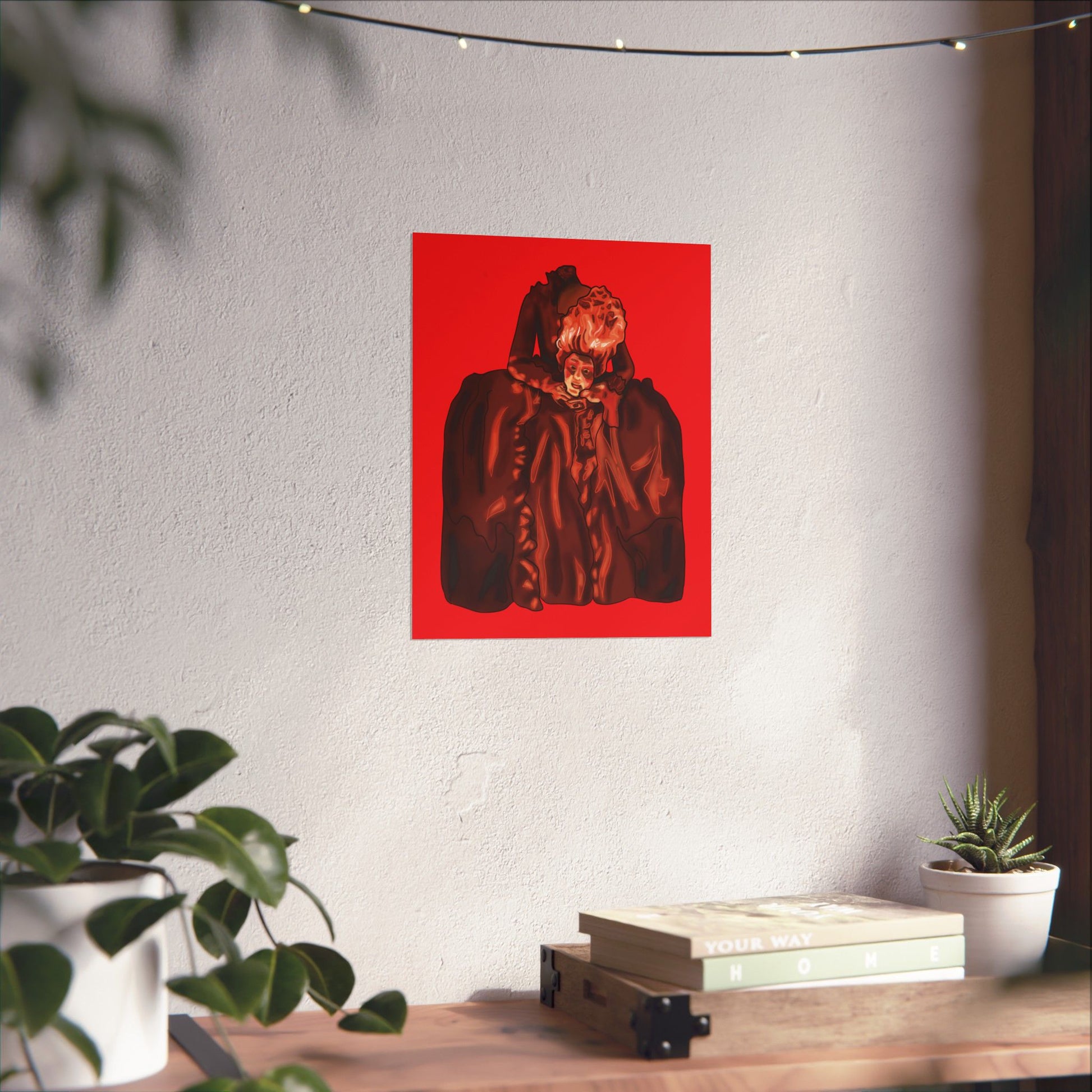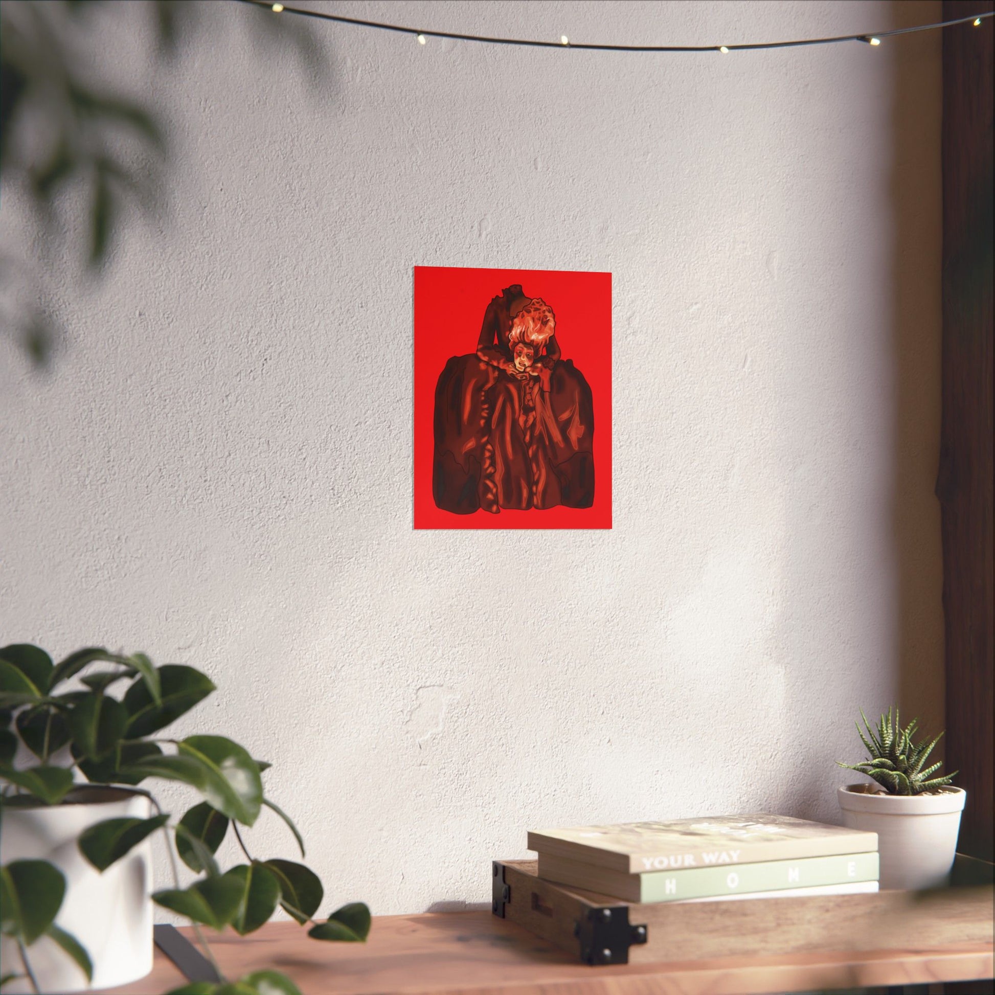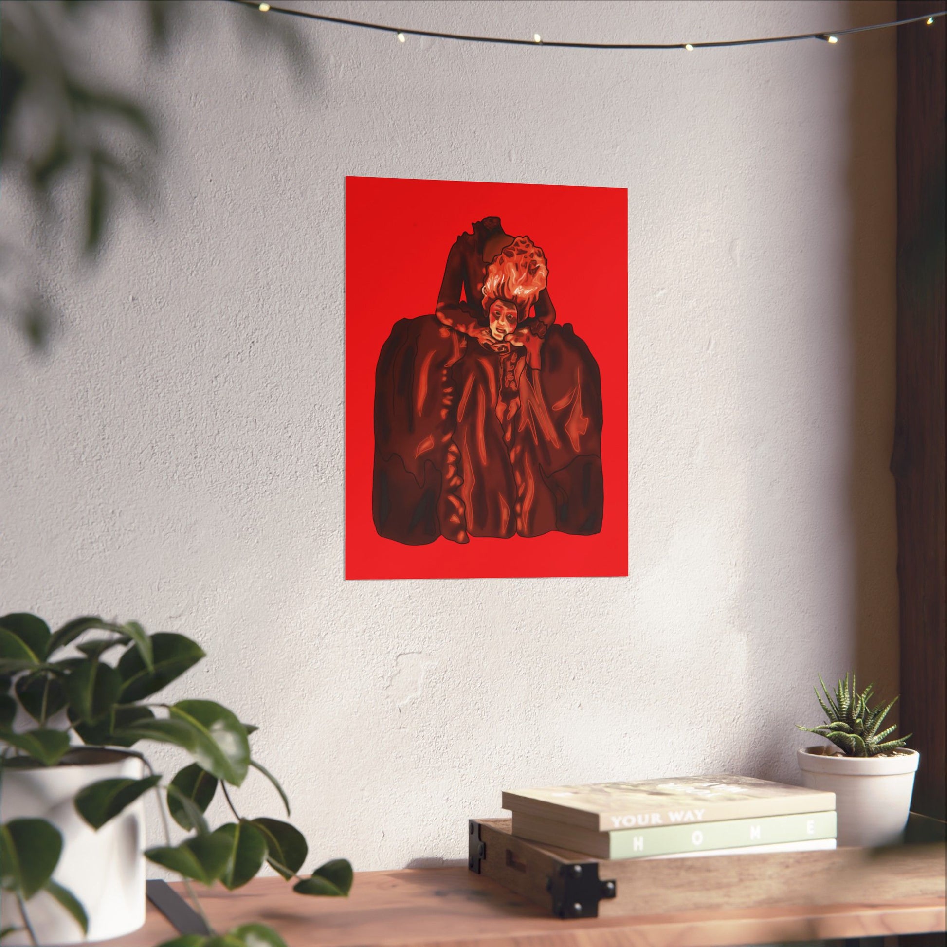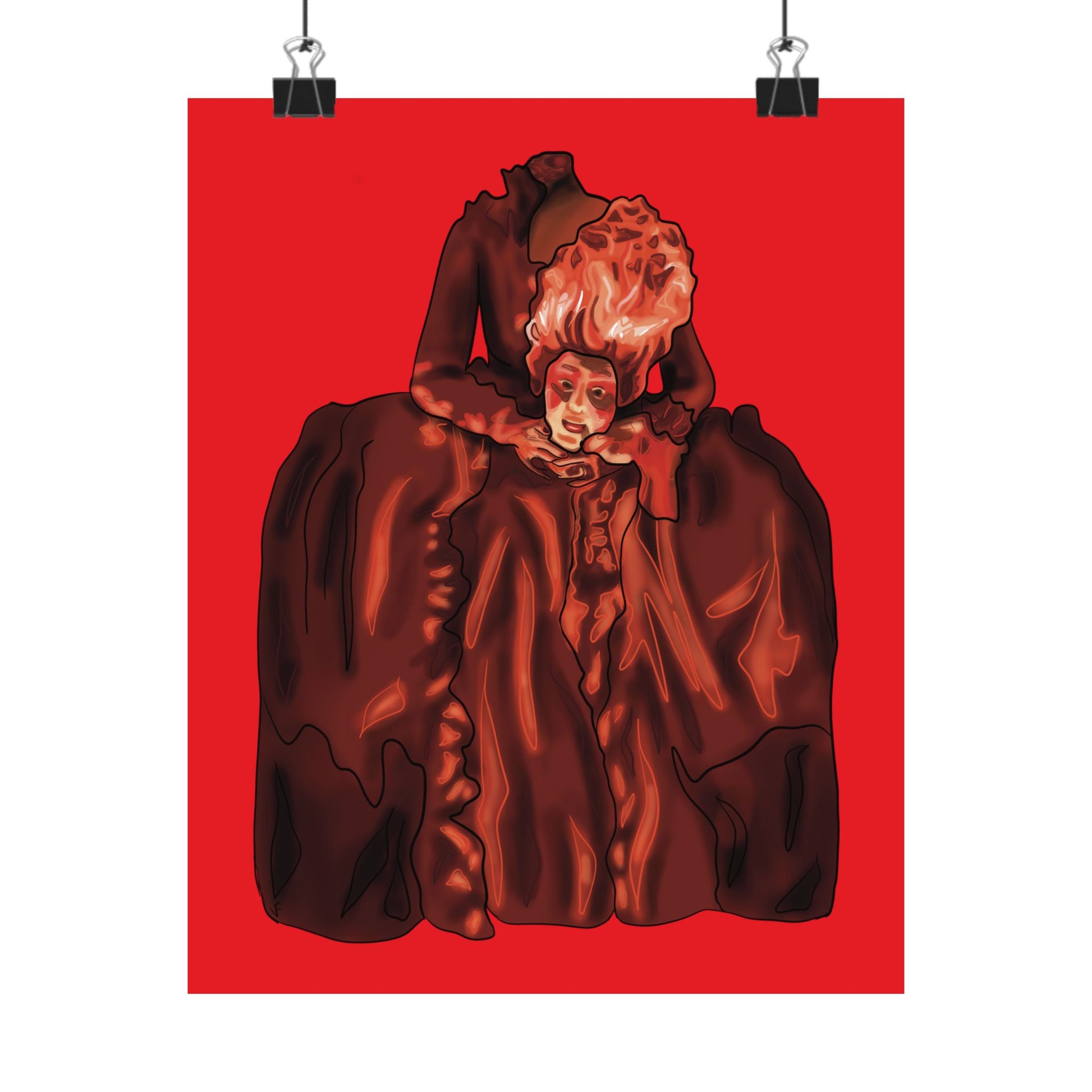 Transform your space with this striking artistic portrait poster featuring a dramatic interpretation of the beheaded Marie Antoinette. The Gothic-style artwork presents an elegant historical figure rendered in deep burgundy hues against a vivid red background, creating a bold visual statement. The dramatic composition showcases elaborate period costume details with flowing fabrics and intricate ruffles, capturing the essence of 18th-century French aristocratic fashion and French rococo style. This sophisticated art print makes an impressive focal point for home decor, perfect for adding a touch of classical elegance to living rooms, studies, or hallways. The poster's distinctive style combines historical elements with contemporary artistic flair, making it an eye-catching piece for art enthusiasts and history buffs alike. Available in various sizes to suit your space, this high-quality print features sharp detail reproduction and rich color saturation that brings the dramatic portrait to life. The striking contrast between the deep browns and vibrant red background creates a powerful visual impact that commands attention in any room.