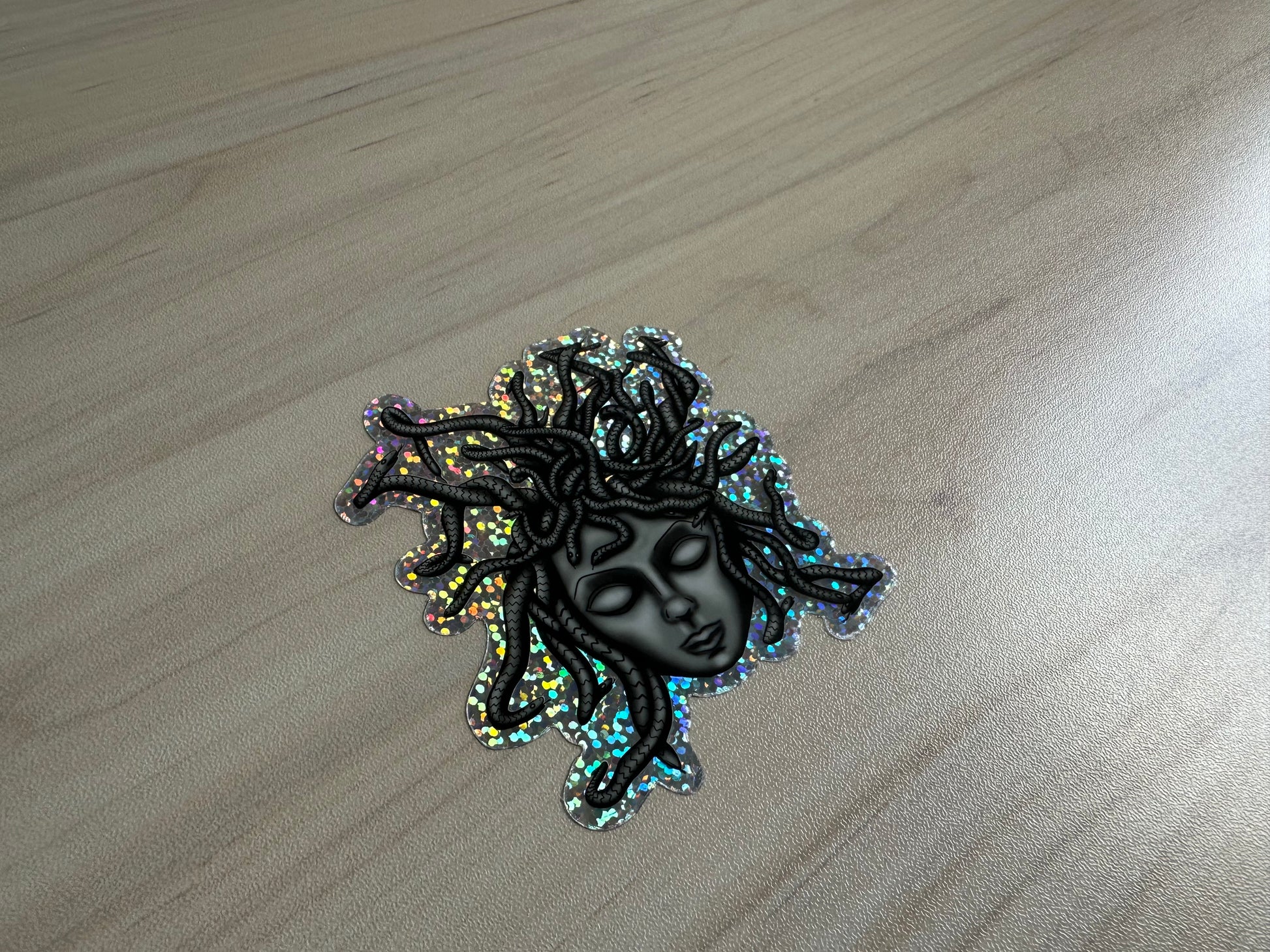 Transform any smooth surface with this striking glitter sticker featuring a dramatic interpretation of the gorgon, Medusa, from Greek mythology. The black and silver design showcases intricate details of serpentine hair with scaled snakes writhing in mesmerizing patterns around a haunting face with closed eyes. This high-quality vinyl sticker makes a bold statement on laptops, water bottles, notebooks, or any flat surface. Each snake in the design features detailed scaling and lifelike movement, creating a sophisticated piece that appeals to mythology enthusiasts and art lovers alike. Perfect for expressing your appreciation of classical mythology or adding a touch of dramatic artistry to your personal items.