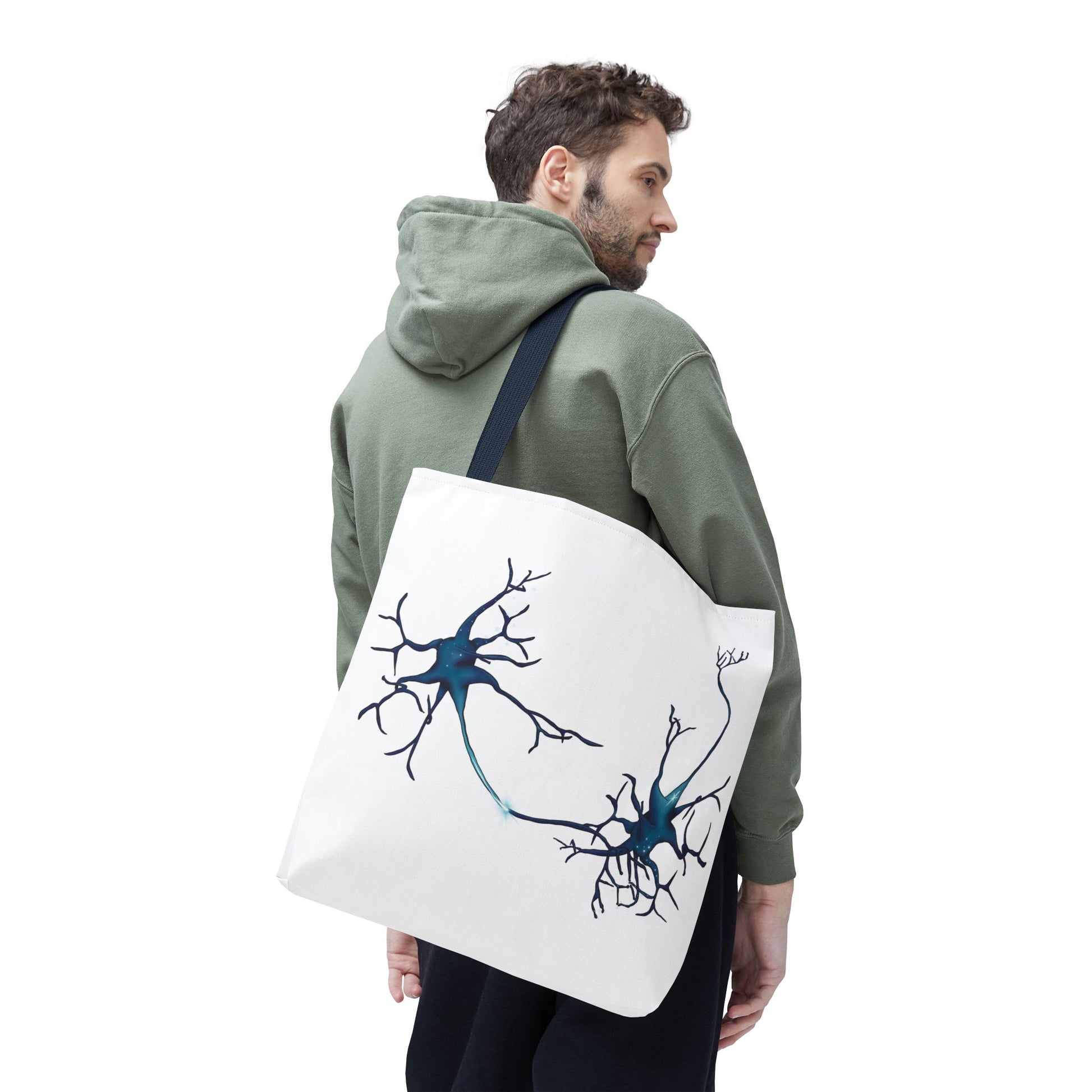 Show your passion for neuroscience with this striking neuron tote bag, featuring an elegant scientific illustration of neural cells in deep navy blue against a crisp white canvas background. The sophisticated design showcases the intricate branching patterns of neurons, making it perfect for neuroscience enthusiasts, medical professionals, anatomists, or anyone who appreciates the beauty of scientific art. The sturdy navy blue handles complement the artwork while providing comfortable carrying. This versatile tote is ideal for carrying books, groceries, or daily essentials while displaying your passion for neuroanatomy. The clean, minimalist design maintains a professional look suitable for academic settings, conferences, or casual outings. The spacious interior offers plenty of room for your belongings, while the durable construction ensures lasting performance. Whether you're a student, researcher, neurologist, or science enthusiast, this unique tote bag combines functionality with intellectual style, making it both a practical accessory and a conversation starter.