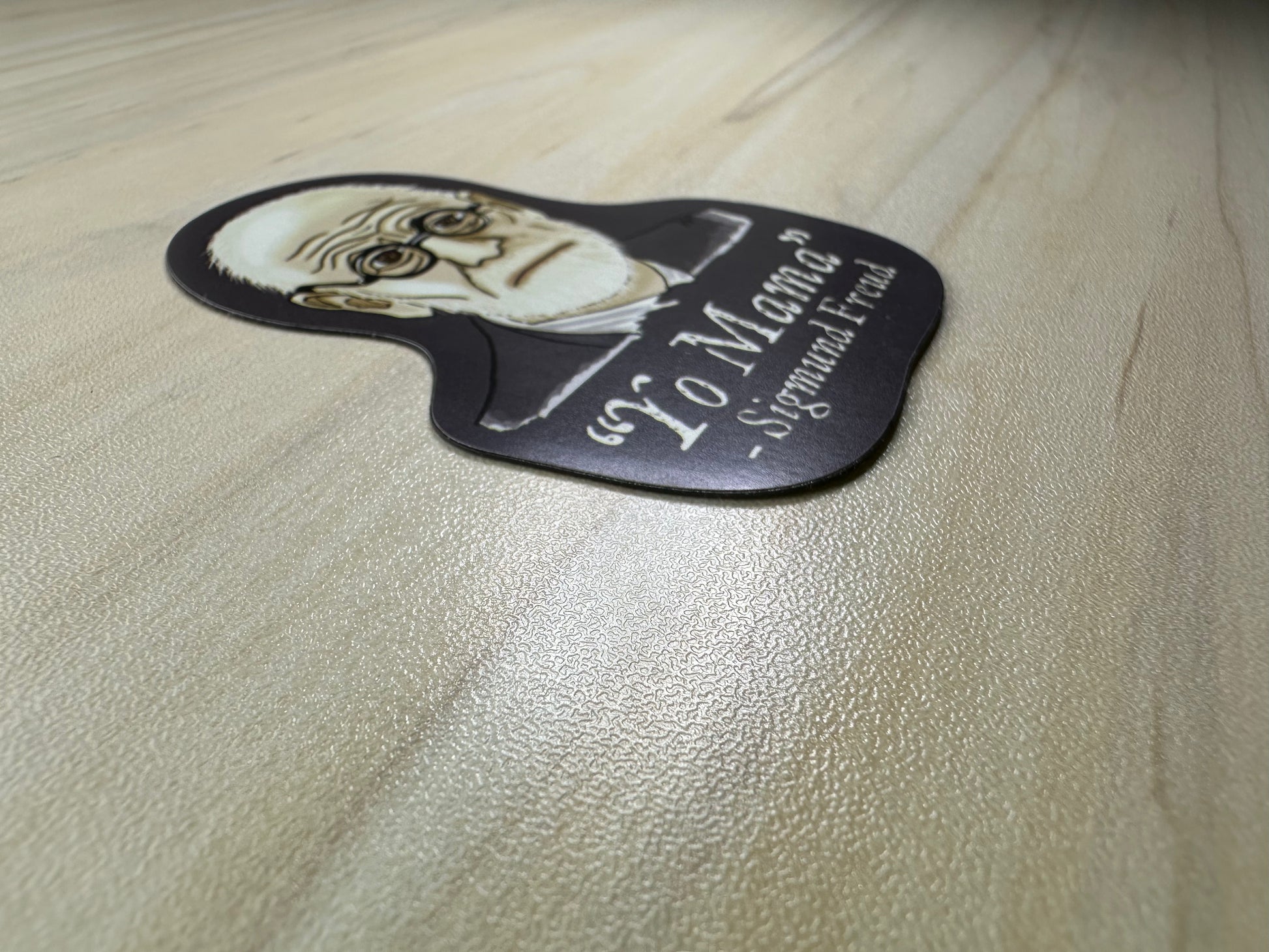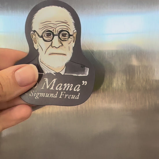 Add a touch of psychological humor to your belongings with this witty vinyl magnet featuring a distinctive illustration and the quote 'Yo Mama’, which is jokingly attributed to Sigmund Freud. The magnet is 3 inches tall and showcases a detailed artistic rendering, complete with signature round glasses and distinguished beard. This durable magnet is perfect for the car, refrigerator, white board, locker, or any metallic, magnetic surface. Whether you're a psychology student, mental health professional, or someone who appreciates clever academic humor, this magnet makes a unique statement. It's an ideal conversation starter that combines classical psychology with contemporary humor, making it a fantastic gift for those in the mental health field or anyone who enjoys intellectual wit.
