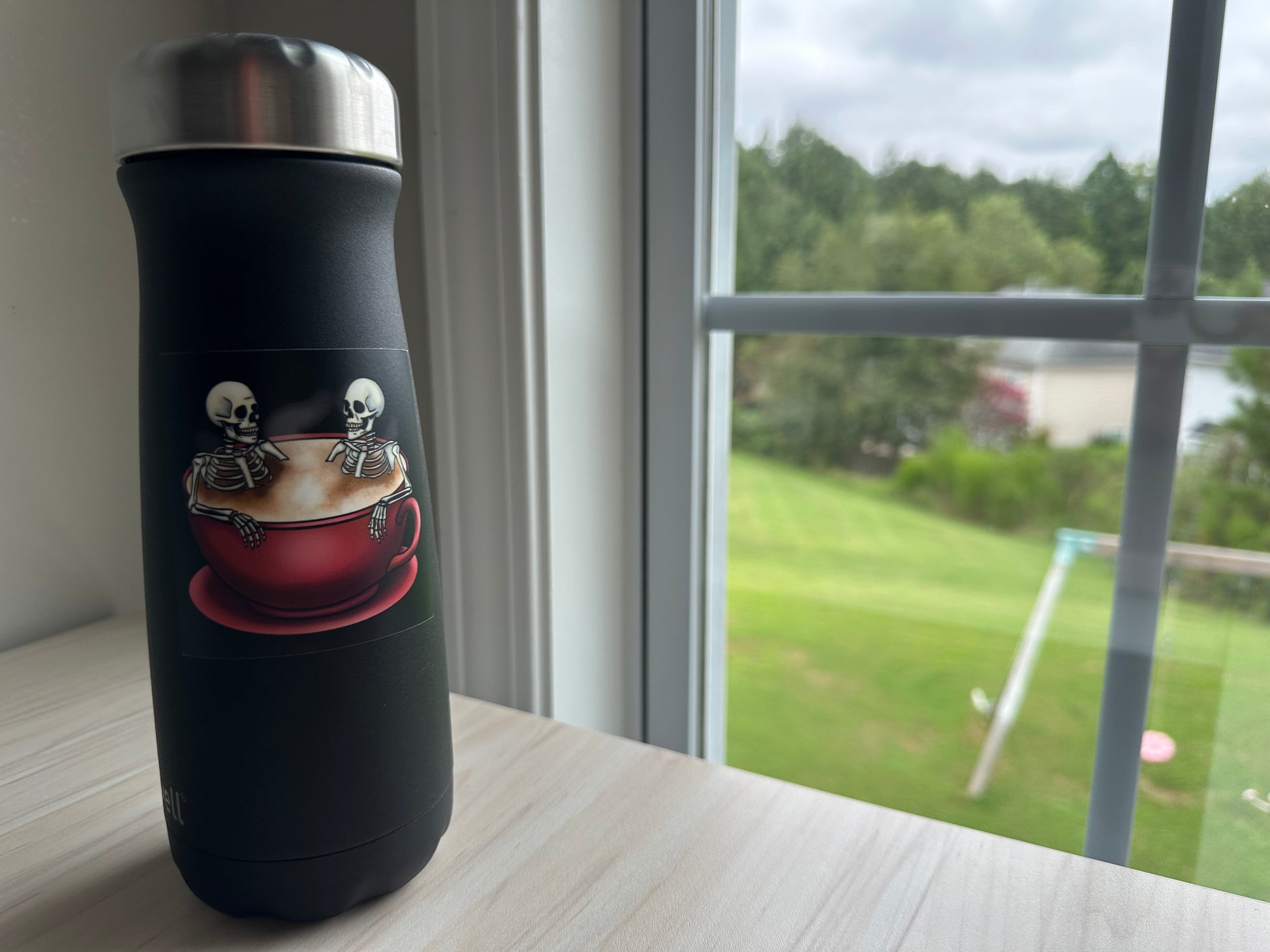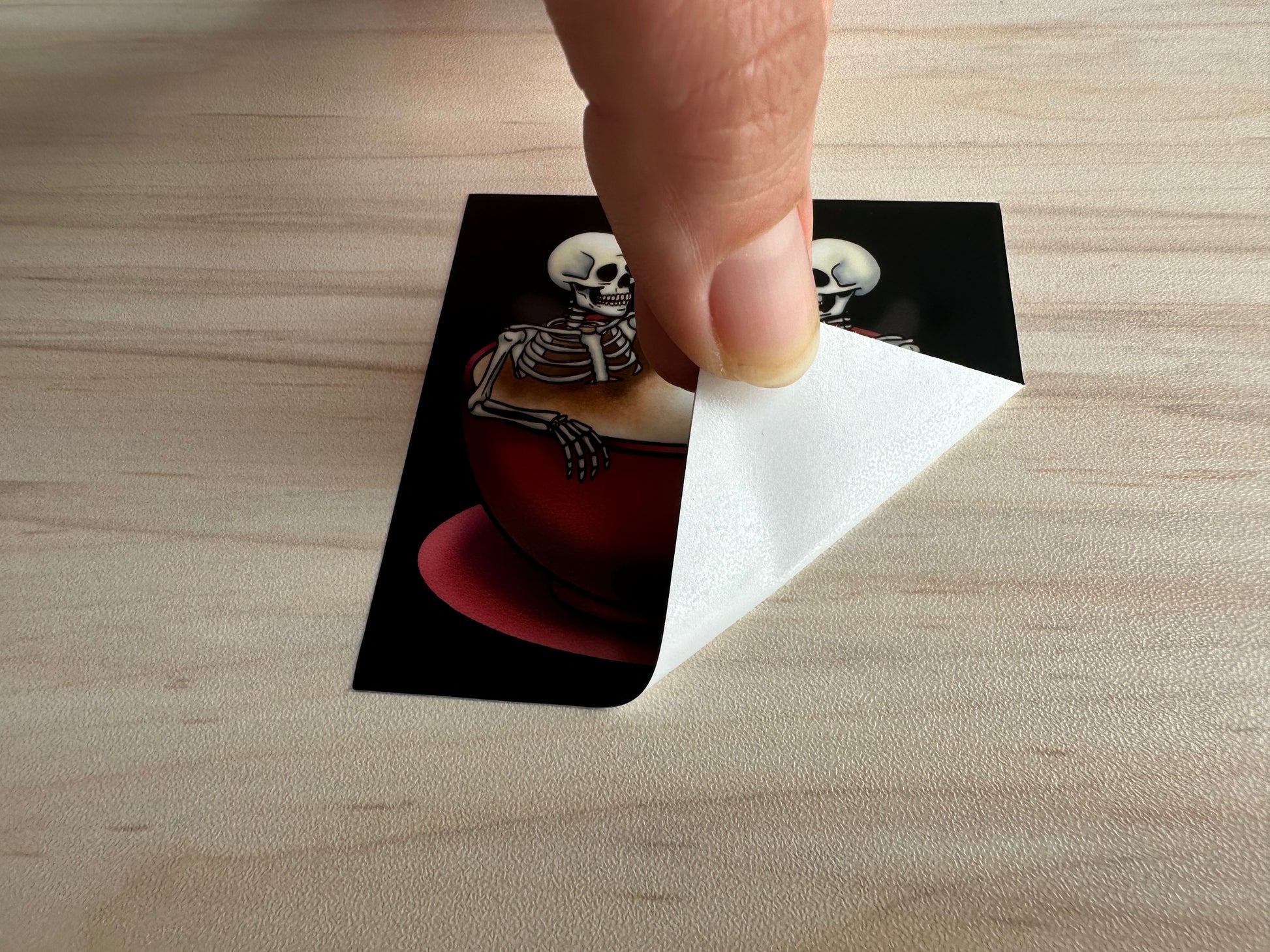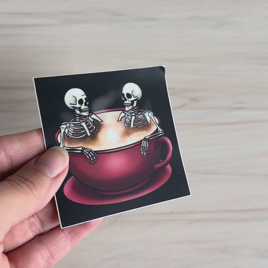 Add a delightfully macabre touch to your space with this whimsical sticker featuring two spooky skeletons enjoying a cozy soak in an oversized coffee cup. The striking design showcases detailed skeleton illustrations in classic bone-white against a rich red coffee cup on a dramatic black background. Perfect for Halloween decoration or year-round gothic aesthetic, this unique sticker combines coffee culture with spooky charm. The skeletons appear to be having a cheerful conversation while relaxing in their steaming coffee hot tub, creating a fun and quirky scene that's sure to spark conversation. This decorative sticker is ideal for personalizing laptops, water bottles, notebooks, or any smooth surface where you want to add a touch of playful gothic flair. The design features excellent detail in the skeletal anatomy and the classic coffee cup shape, making it a standout piece for both coffee enthusiasts and fans of skeleton art.