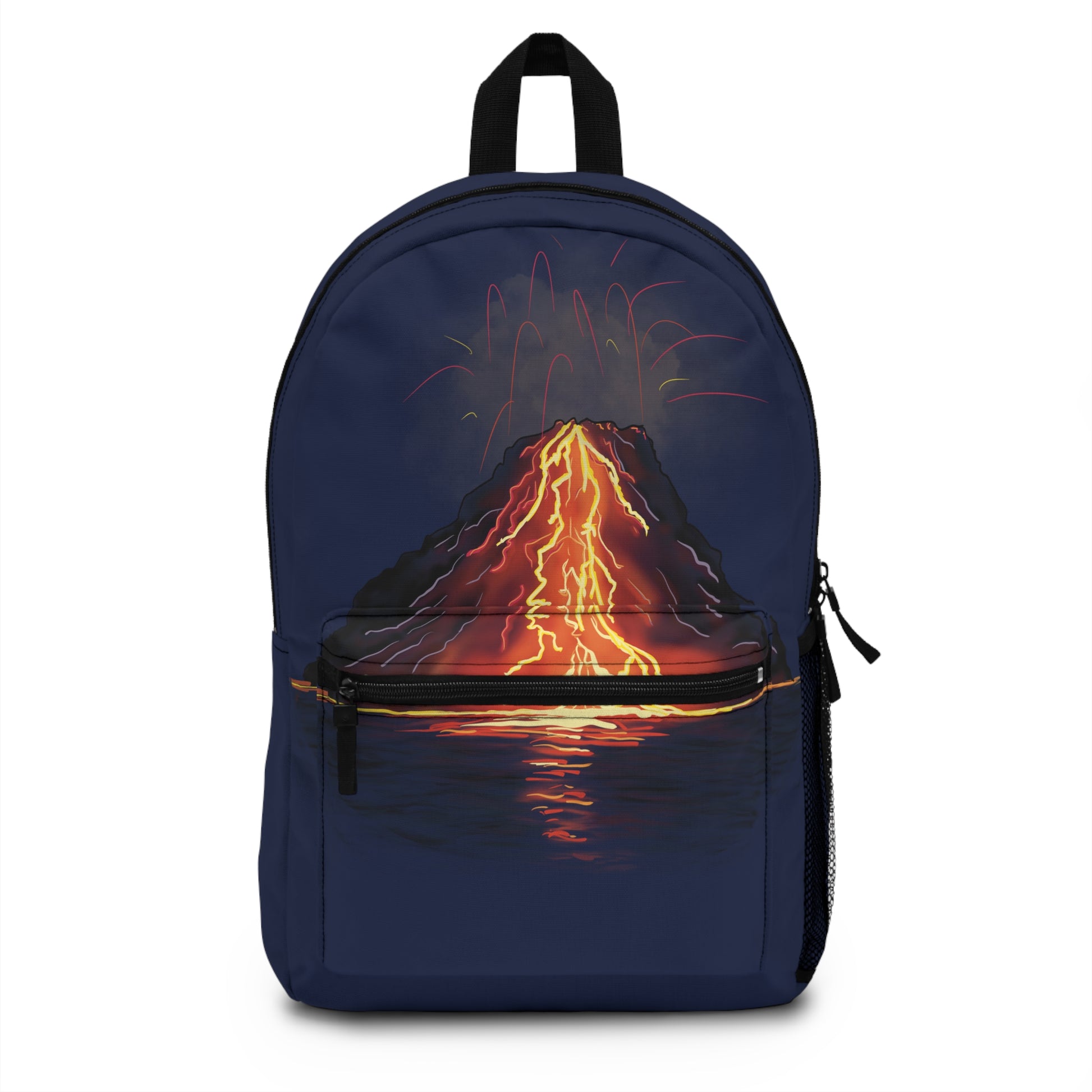 Turn heads with this striking navy blue backpack featuring a dramatic erupting volcano design. The vivid artwork depicts an active volcano with glowing lava flows and sparks against a dark night sky backdrop, creating an eye-catching visual effect. Perfect for school, work, travel, or hiking, this backpack combines practical functionality with stunning artistic design. Whether you're an outdoor enthusiast, geologist, student, or simply appreciate unique accessories, this volcano-themed backpack is sure to ignite conversations wherever your adventures take you.