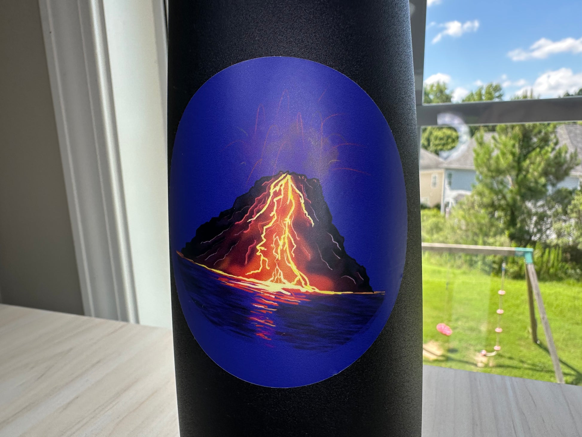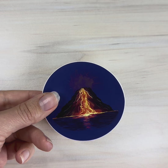 Transform any smooth surface with this stunning volcano sticker. This premium vinyl decal captures the raw power of nature with its dramatic design featuring a glowing volcanic eruption against a blue ocean backdrop. This water-resistant sticker showcases vibrant lava flows and dramatic smoke effects in eye-catching detail. Perfect for personalizing laptops, water bottles, notebooks, or any flat, clean surface. Whether you're a nature enthusiast, geology buff, or simply appreciate stunning artwork, this high-quality decal brings a touch of natural wonder to your everyday items.